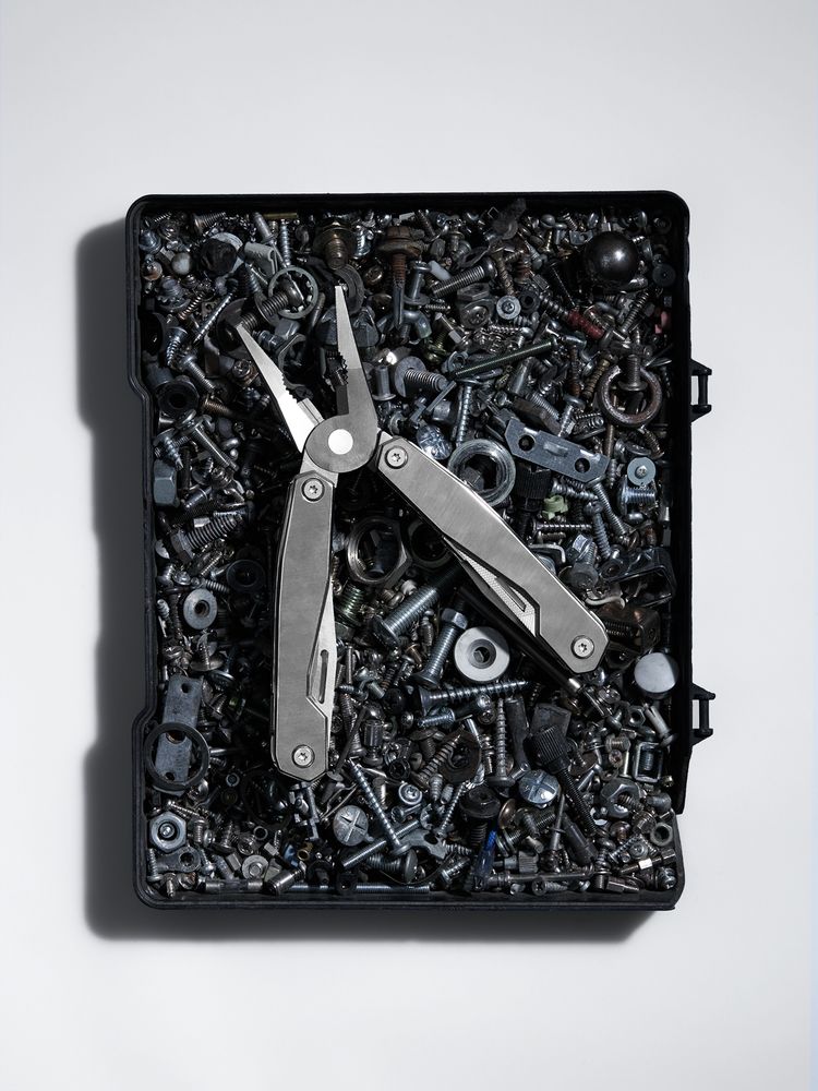 В комплекте мультитул, чехол и набор из 4 двусторонних съемных бит.