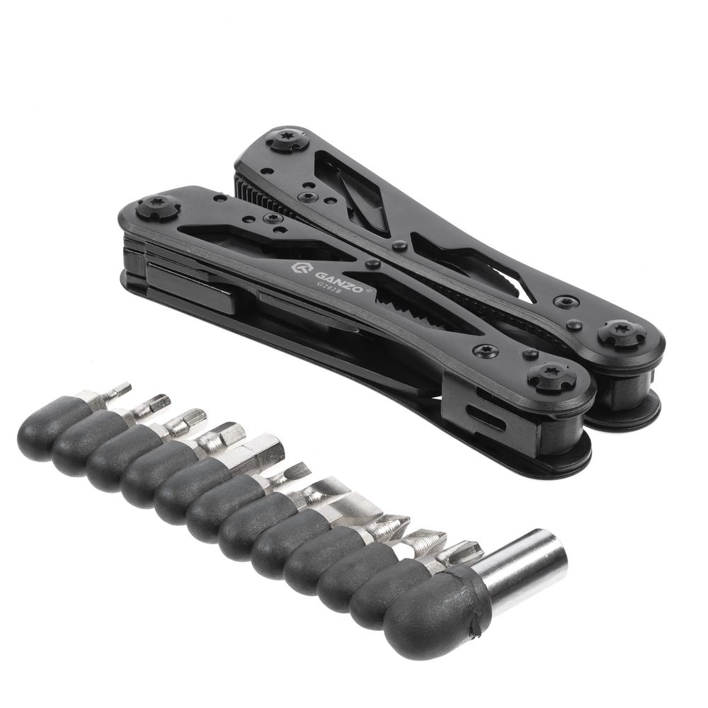 В комплекте мультитул, чехол и набор из 12 съемных бит.