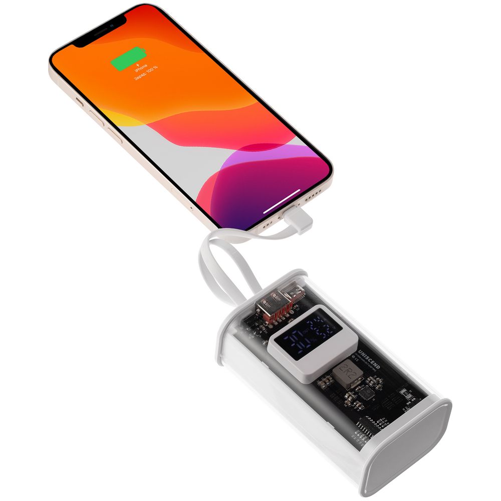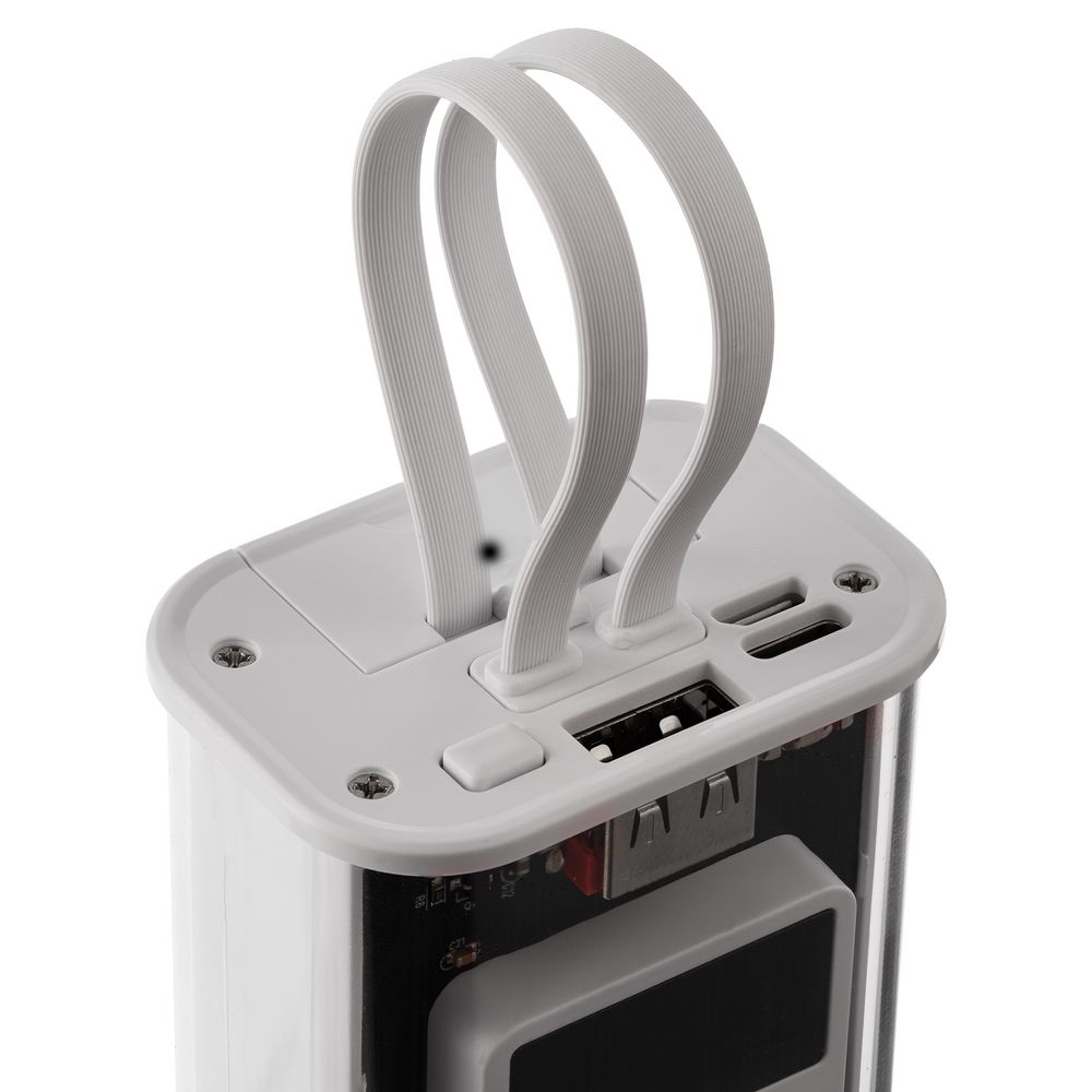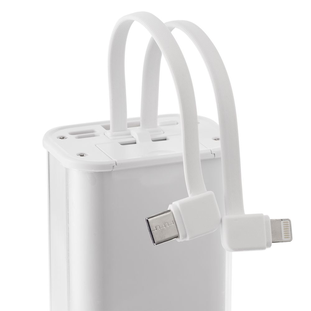 Встроенные кабели позволяют заряжать устройства с разъемами USB Type-C и Lightning.