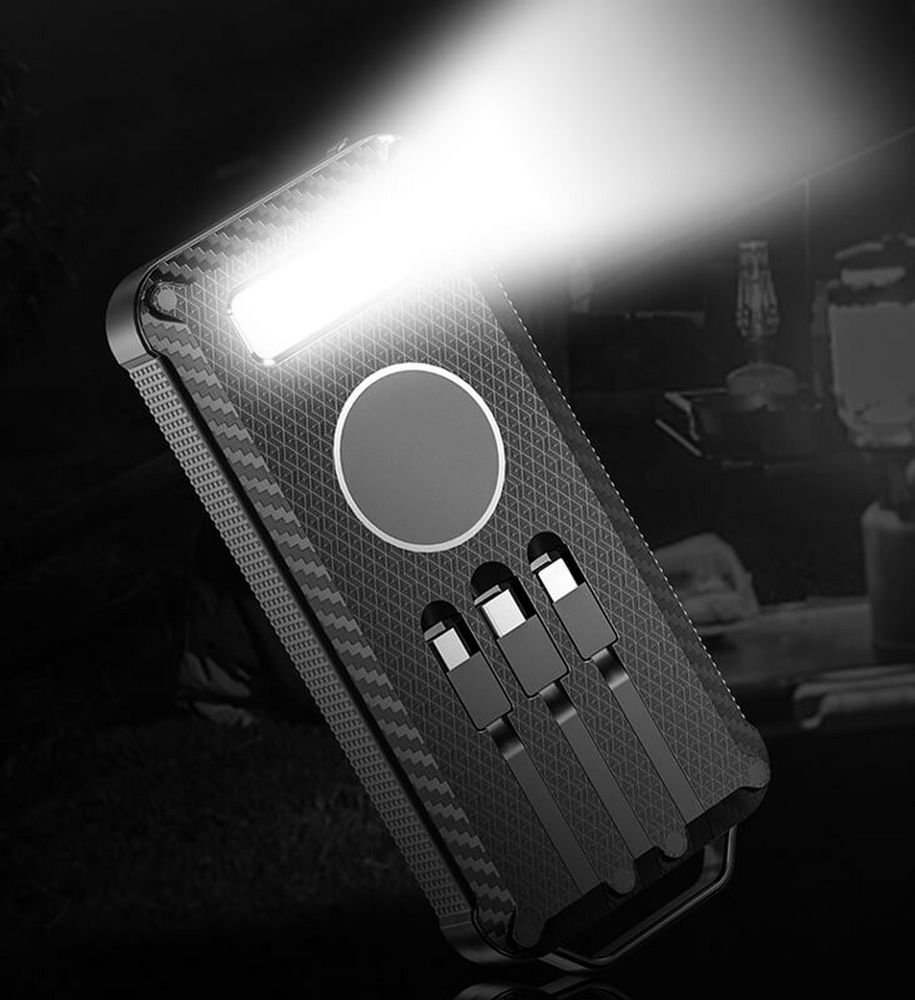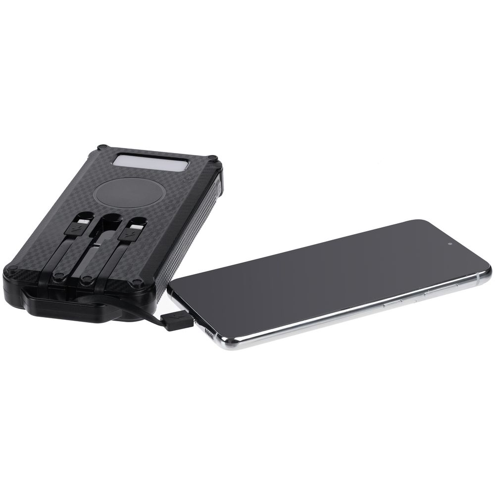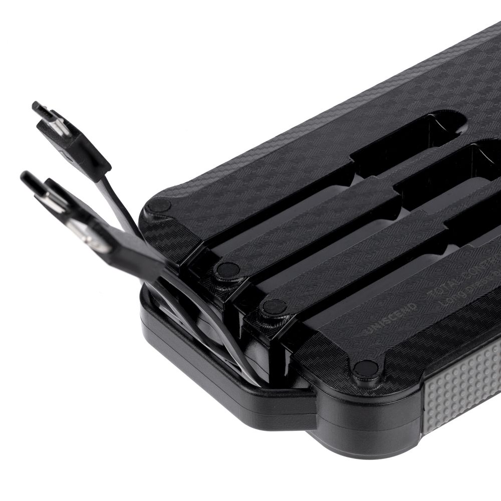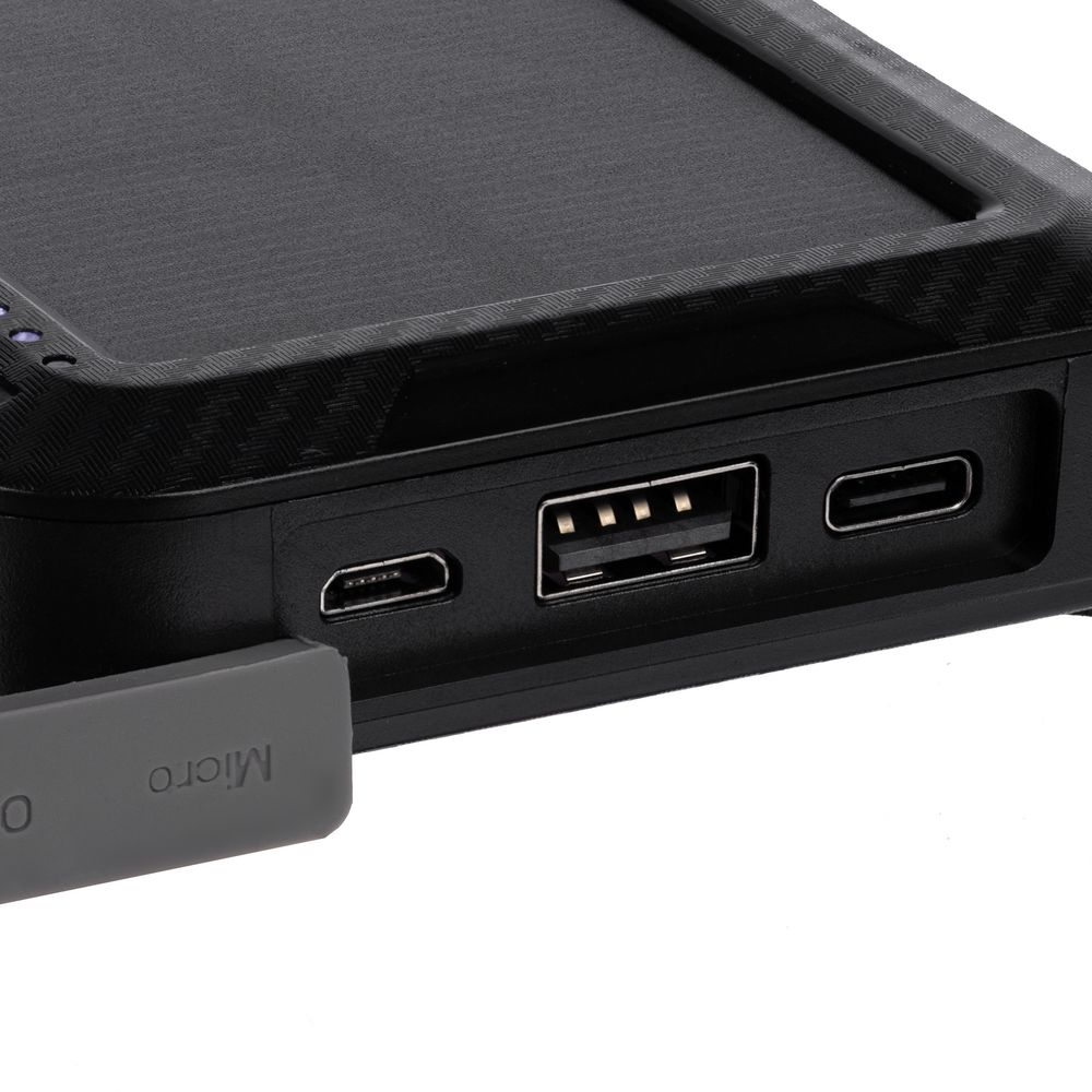 Прорезиненные вставки и рисунок на корпусе с имитацией карбона добавляют хорошей агрессивности внешнему виду аккумулятора — сразу видно, что его хозяин готов к приключениям.