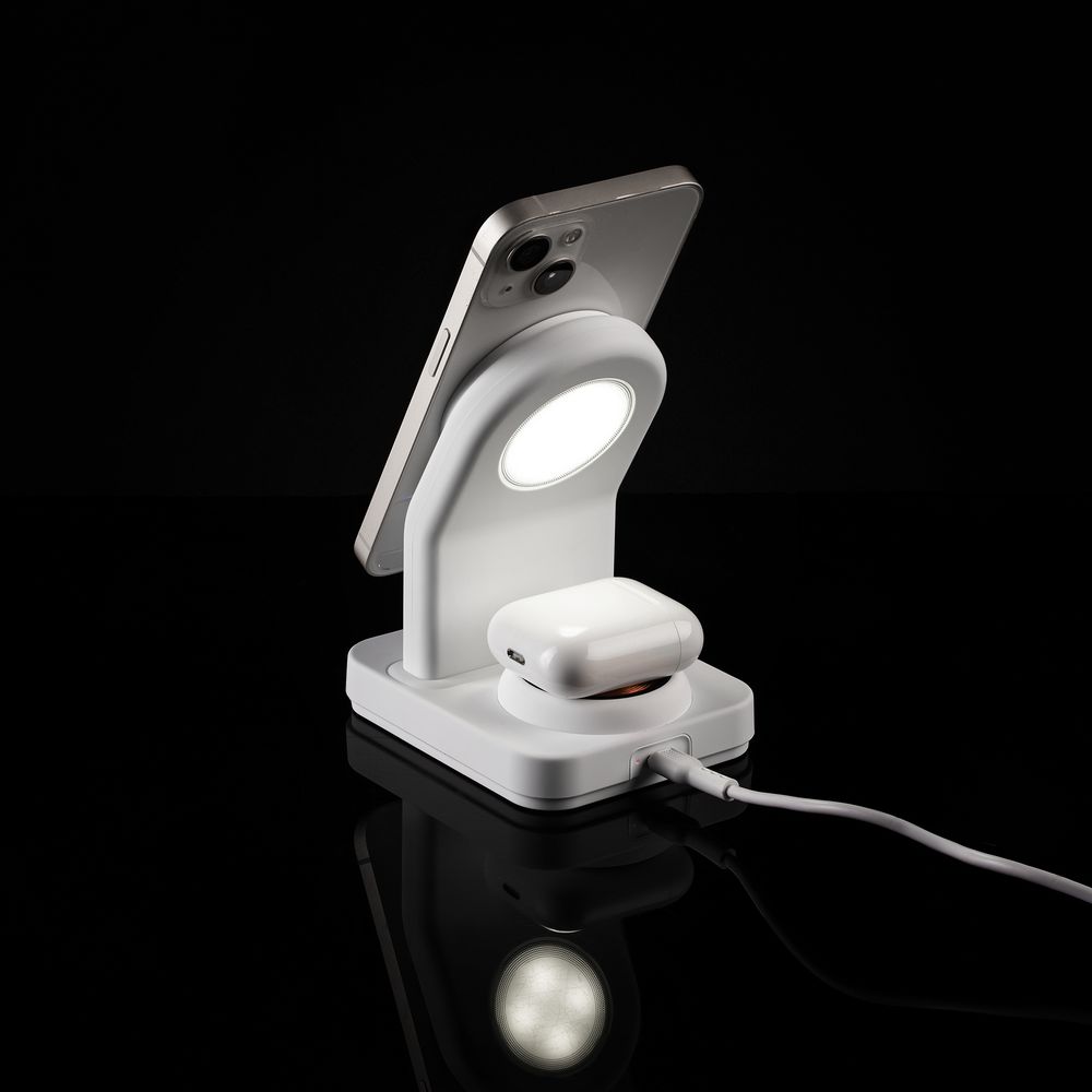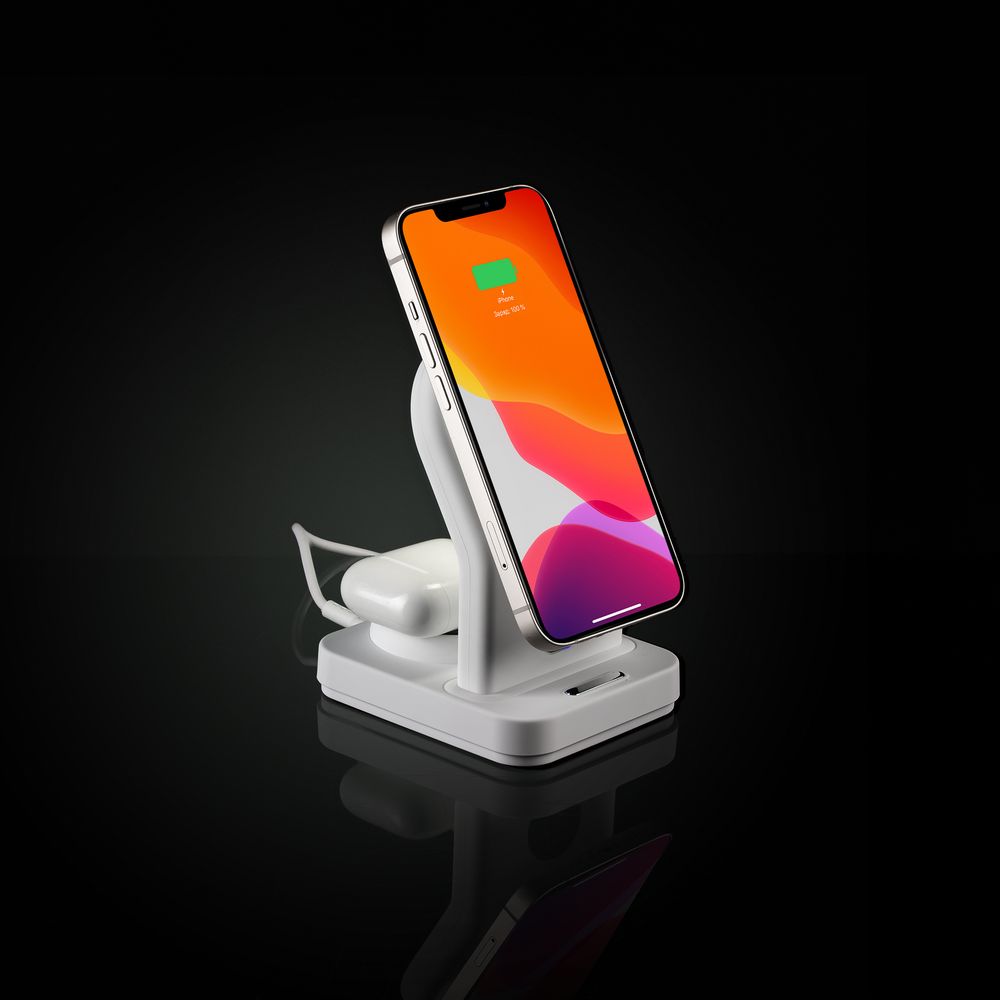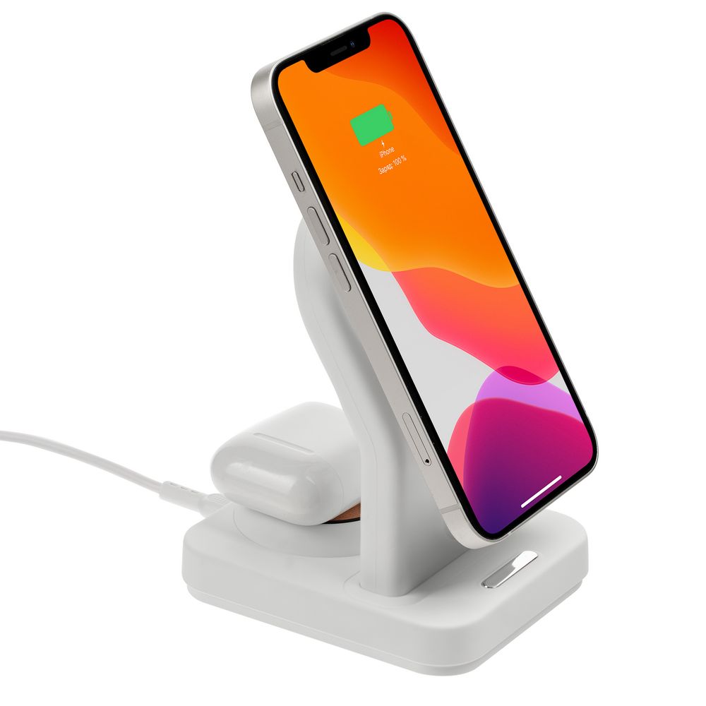 iPhone 12–15 c магнитами MagSafe могут удерживаться на основной области станции. Ранние или компактные модели iPhone или смартфоны с диагональю 5,7–6' на OS Android можно оснастить специальным адаптером Magmate или чехлом со встроенным кольцевым магнитом сзади.