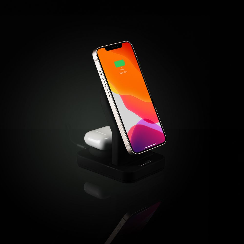 iPhone 12–15 c магнитами MagSafe могут удерживаться на основной области станции. Ранние или компактные модели iPhone или смартфоны с диагональю 5,7–6' на OS Android можно оснастить специальным адаптером Magmate или чехлом со встроенным кольцевым магнитом сзади.