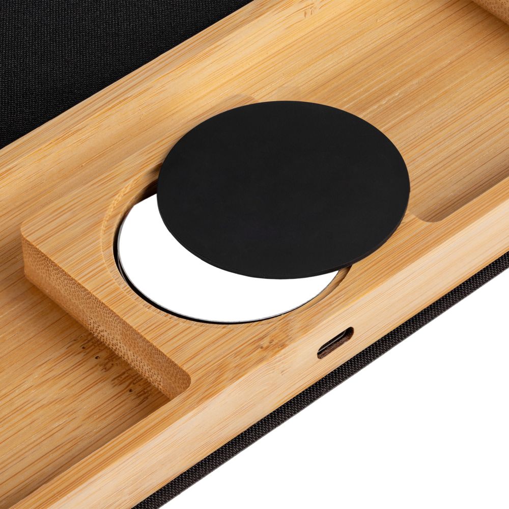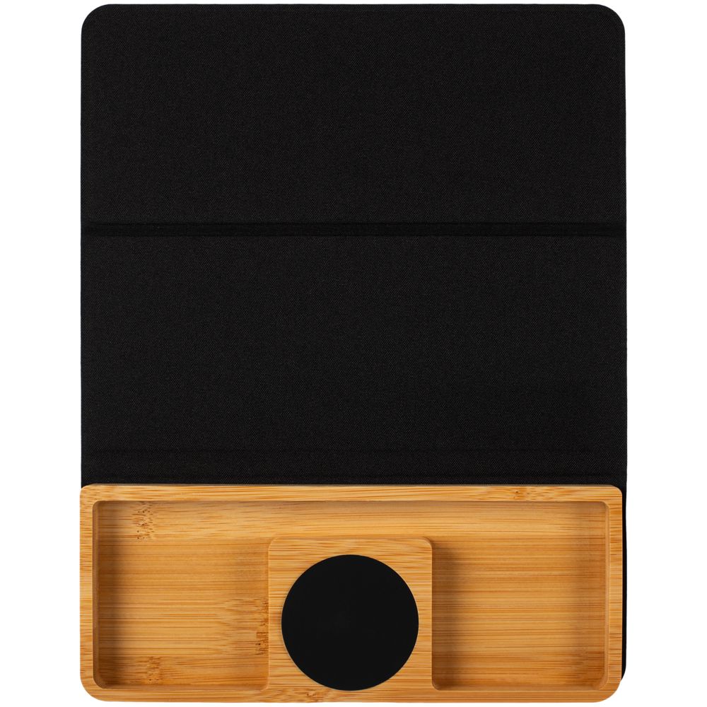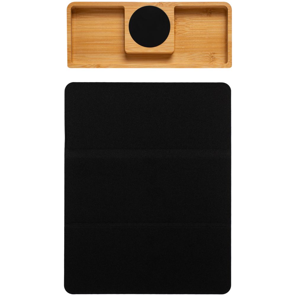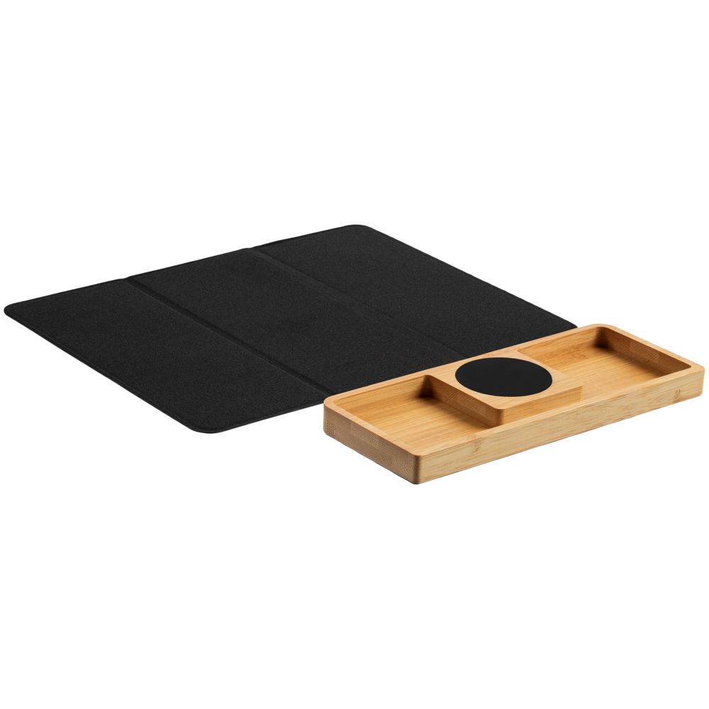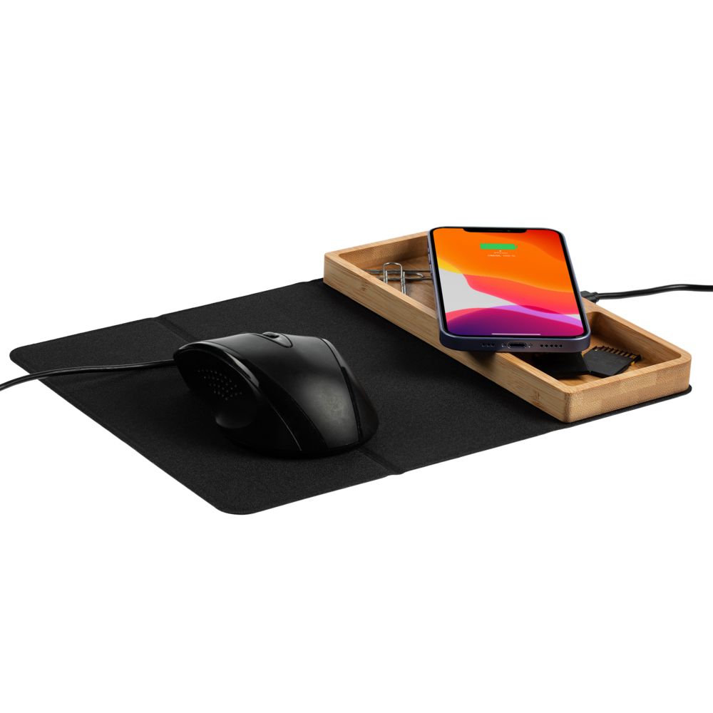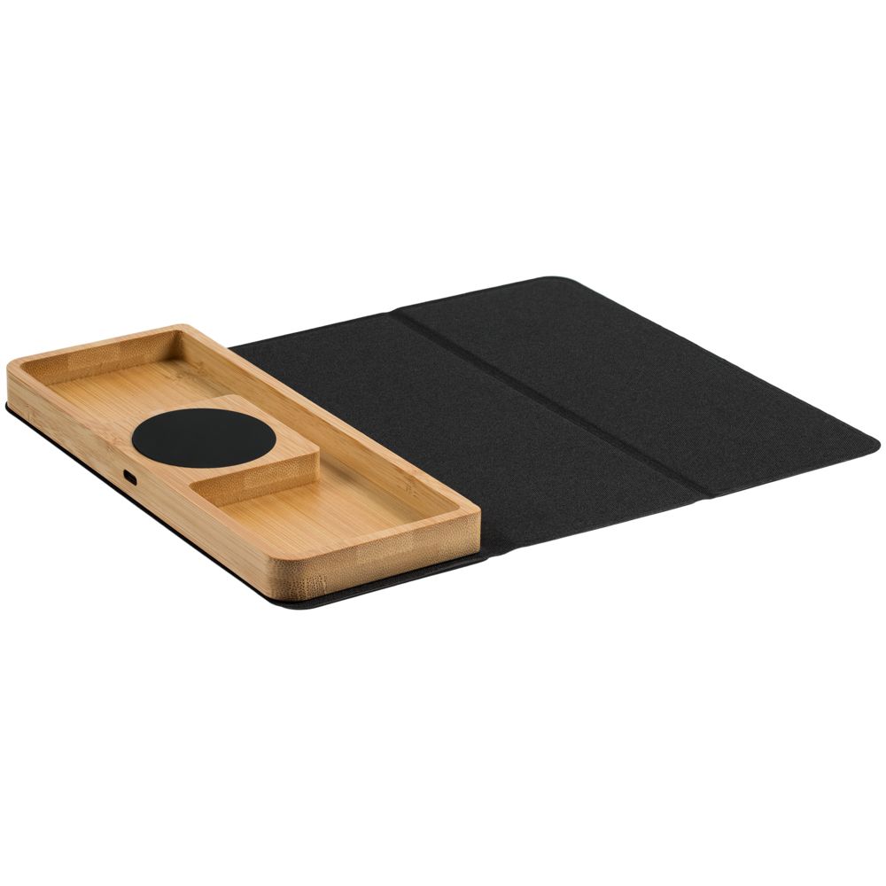 На пластиковом шильдике, под которым размещен сенсор зарядки, можно сделать гравировку логотипа, который будет эффектно светиться при подключении кабеля к источнику питания.Органайзер с ковриком для мышки и беспроводной зарядкой.
