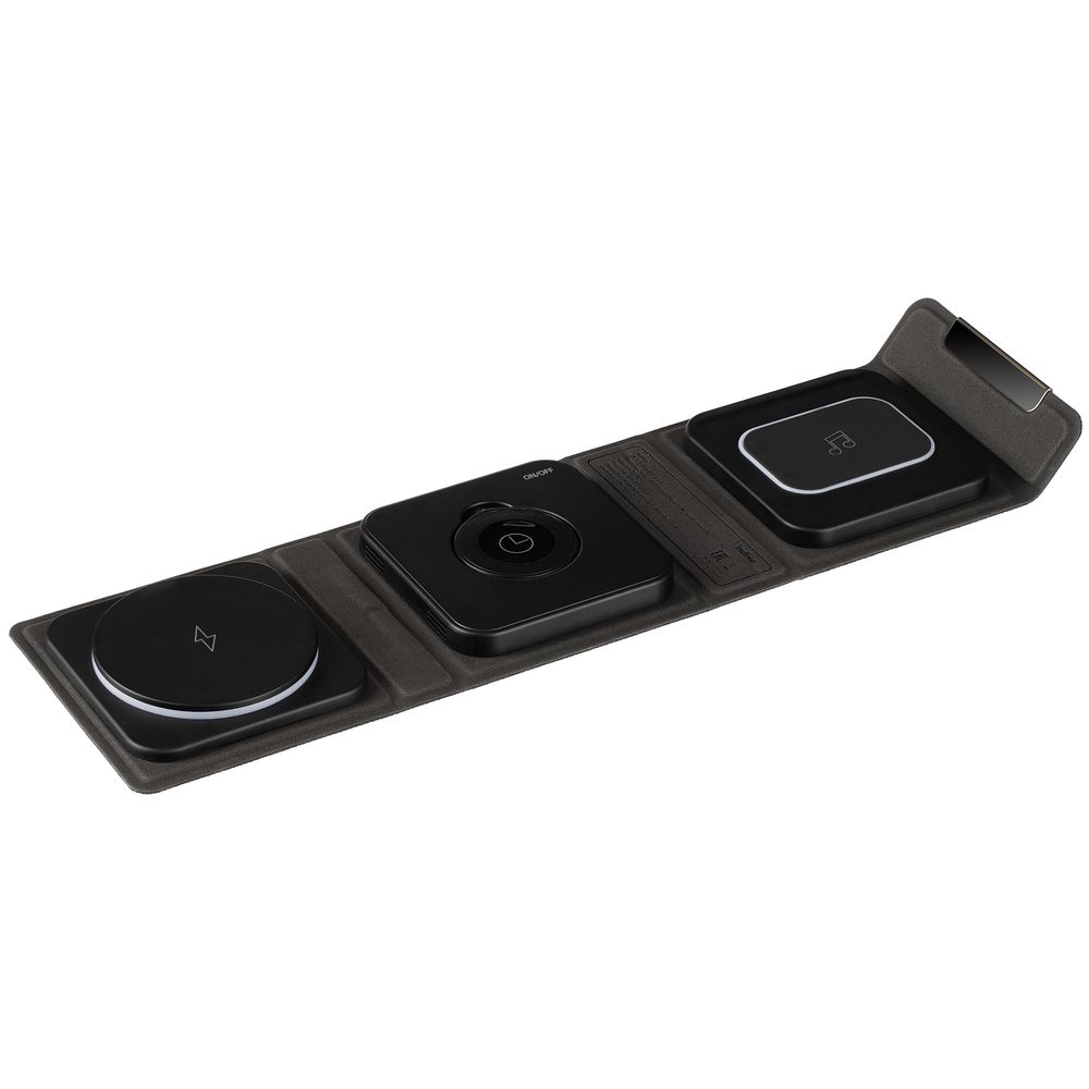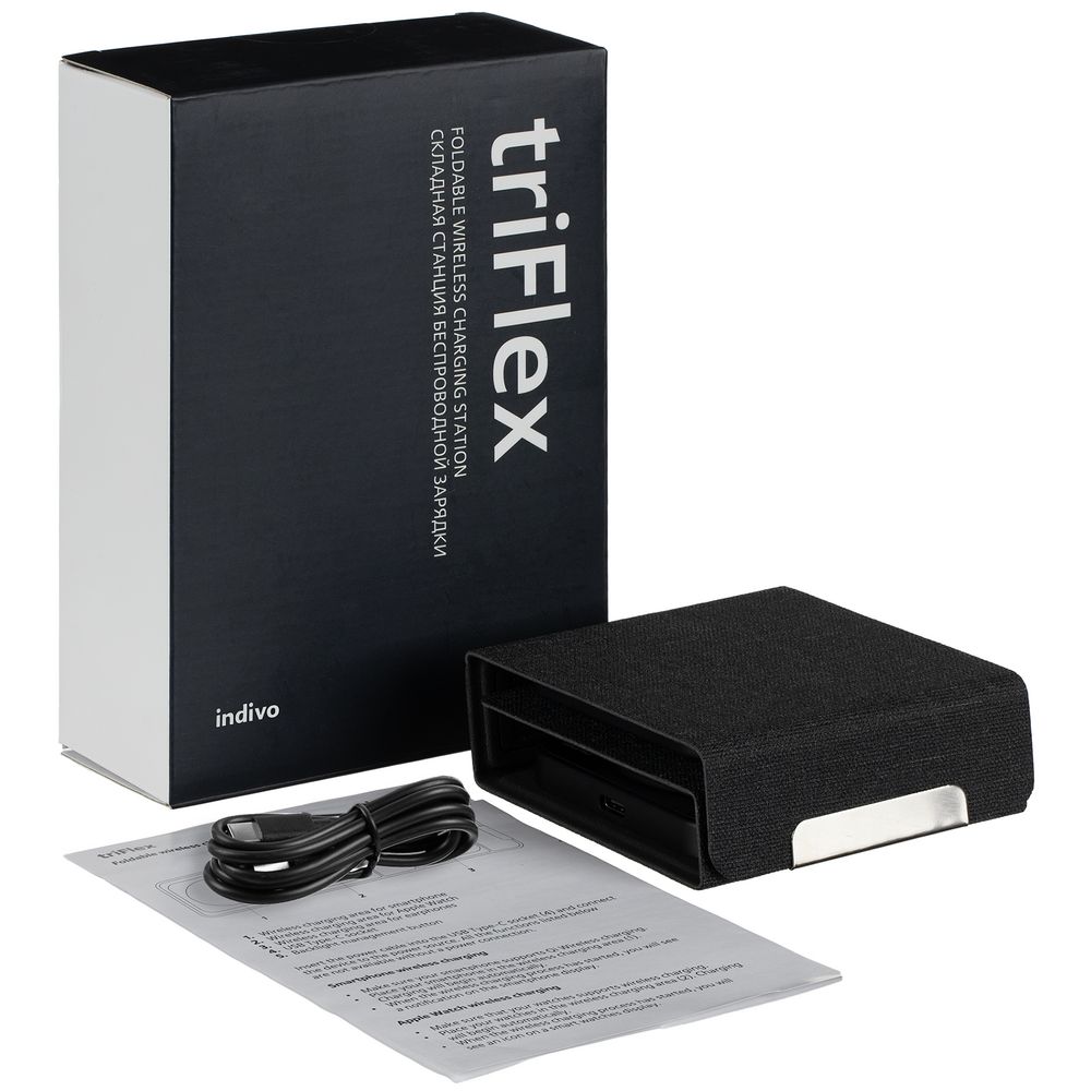 У нас Вы можете заказать Складная станция беспроводной зарядки triFlex, черная качественного бренда Indivo с логотипом по выгодной цене. Выберите способ нанесения логотипа и добавьте товар в корзину. Окончательную полную стоимость с брендированием по Вашему эскизу и доставкой сообщит наш менеджер после оформления заказа.