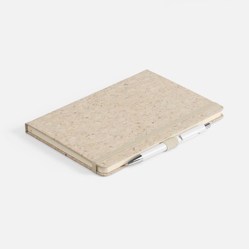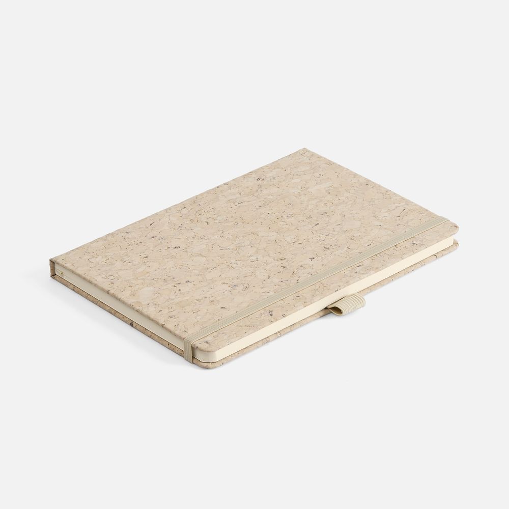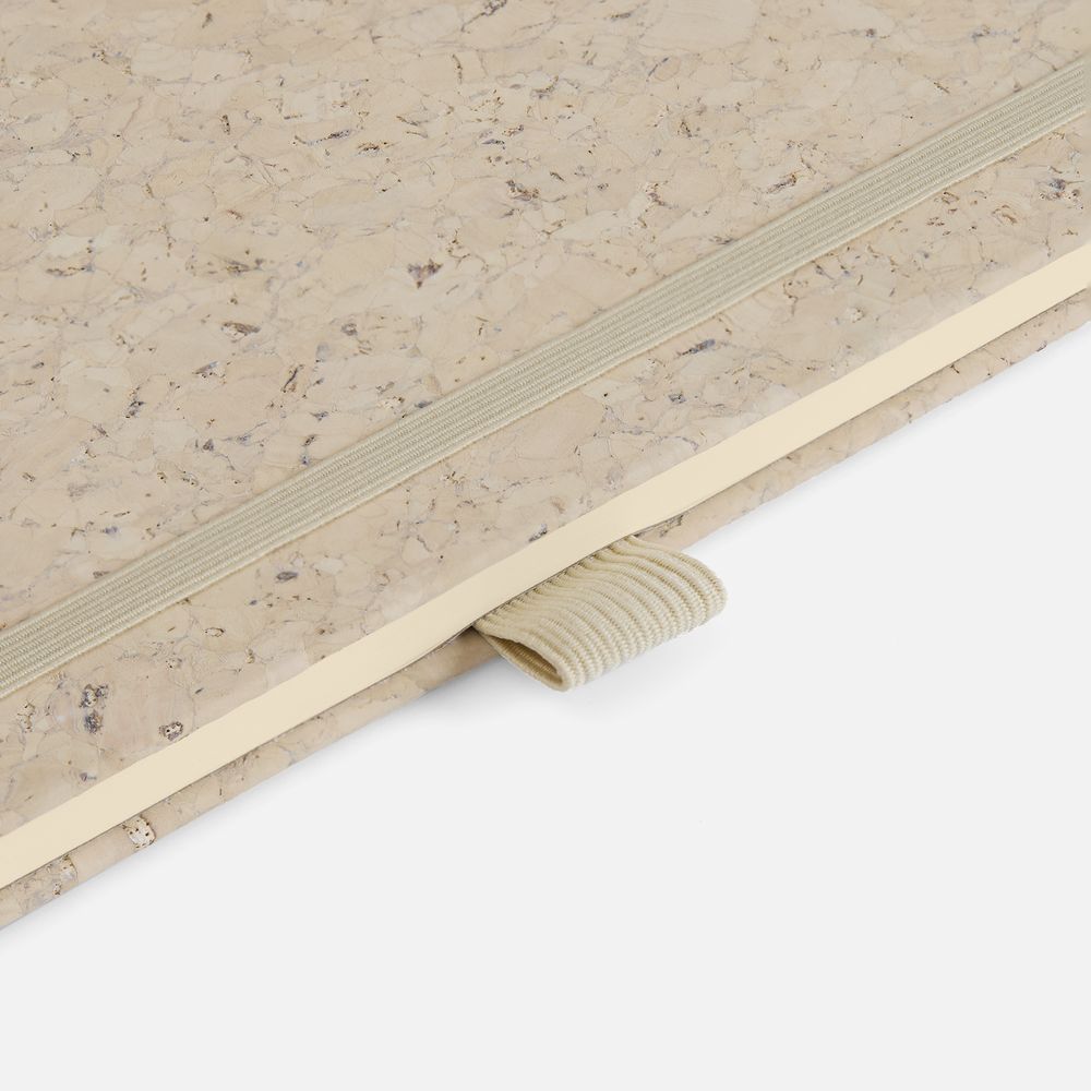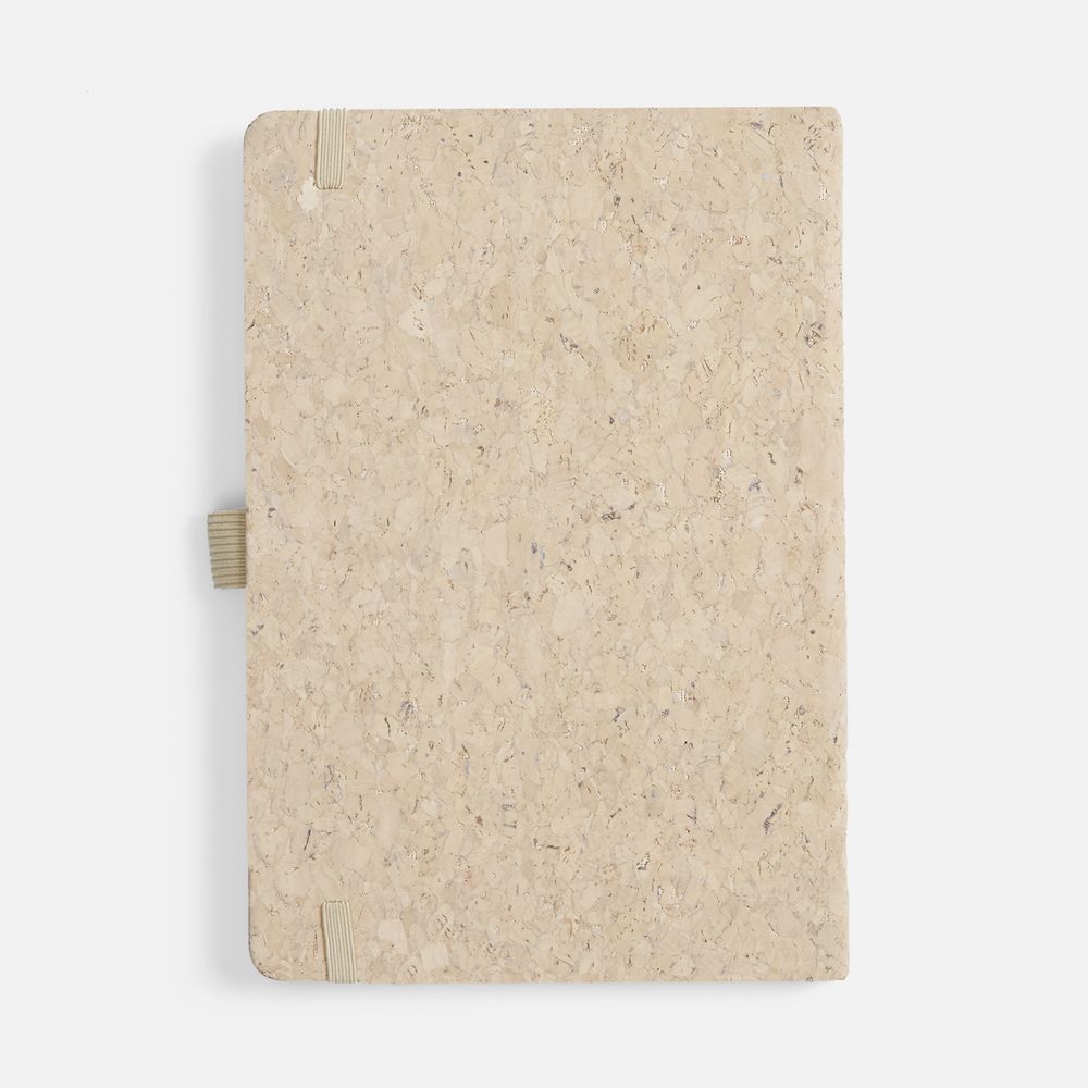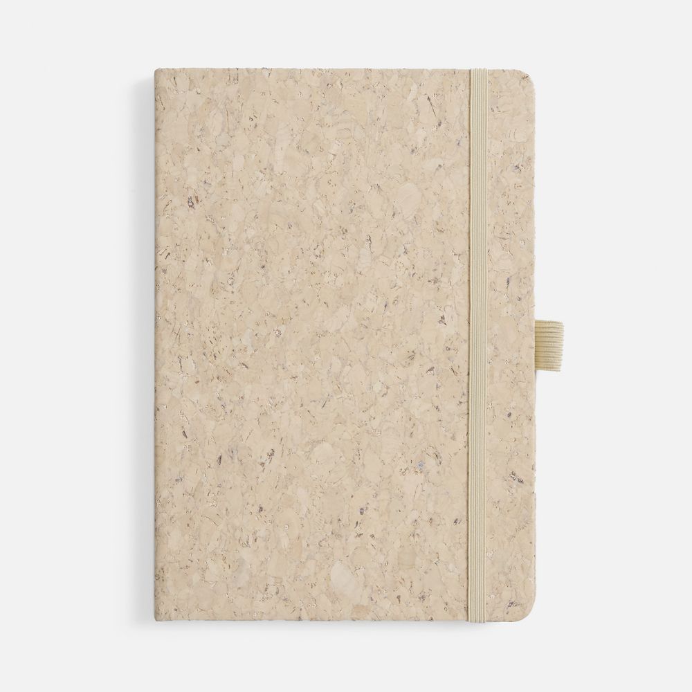 Блокнот с твердой обложкой из натуральной окрашенной пробки, дополнен петлей-резинкой для ручки, ляссе и резинкой в цвет обложки.