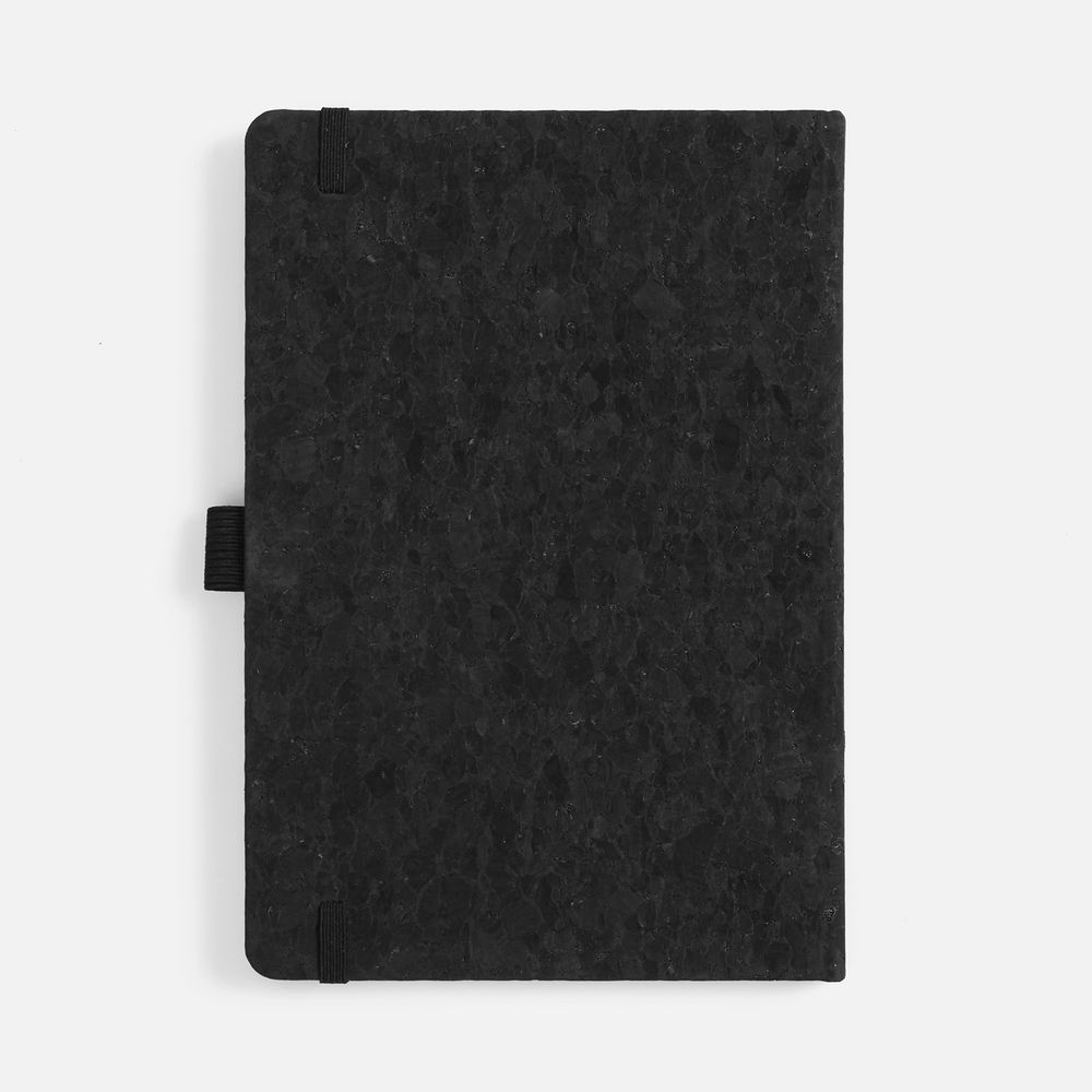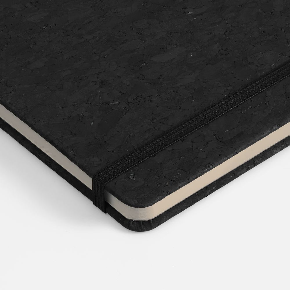Блокнот с твердой обложкой из натуральной окрашенной пробки, дополнен петлей-резинкой для ручки, ляссе и резинкой в цвет обложки.