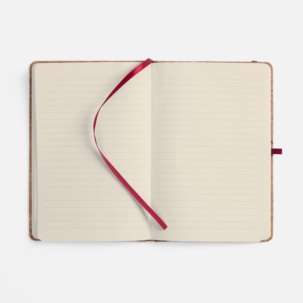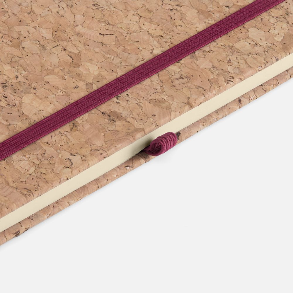 Блокнот в твердой обложке из натуральной неокрашенной пробки, дополнен цветными петлей-резинкой для ручки, ляссе и резинкой на обложку.