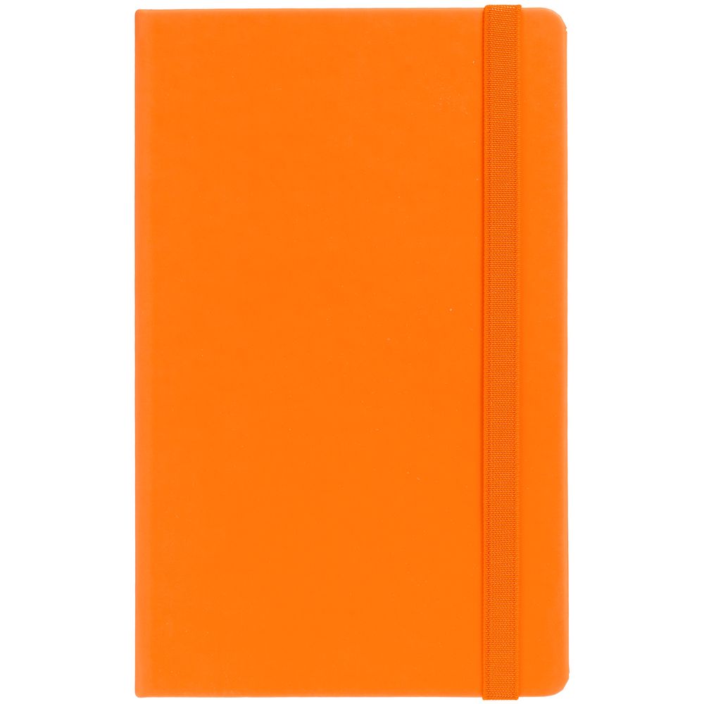 Блокнот в твердой обложке, выполнен из материала Soft Touch, оранжевый ОО, дополнен резинкой и ляссе в цвет обложки.