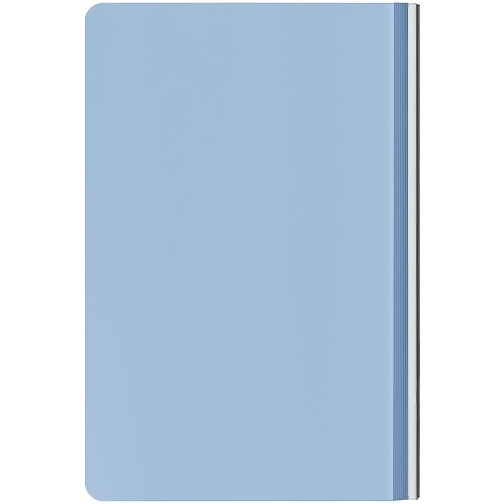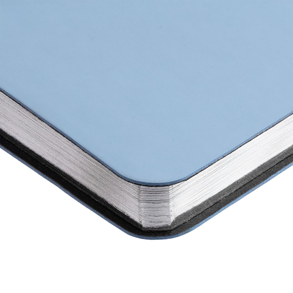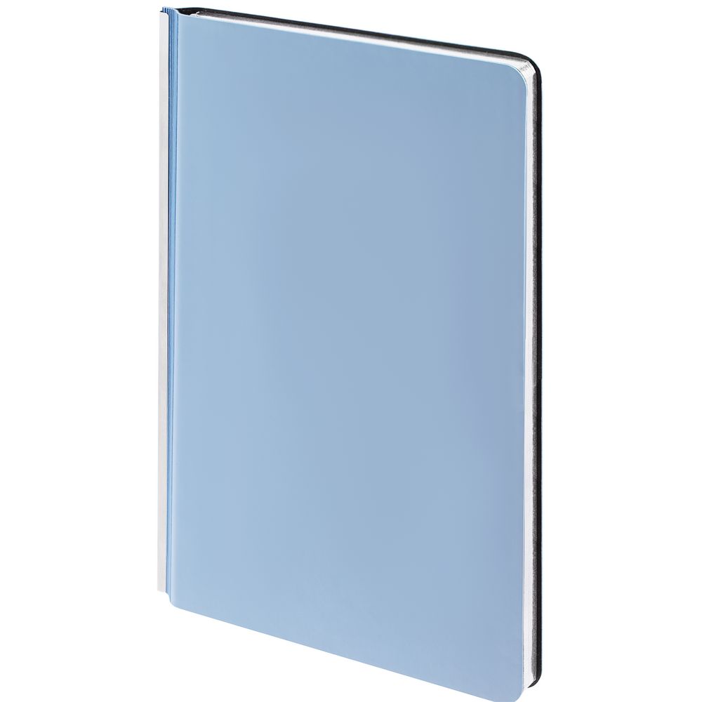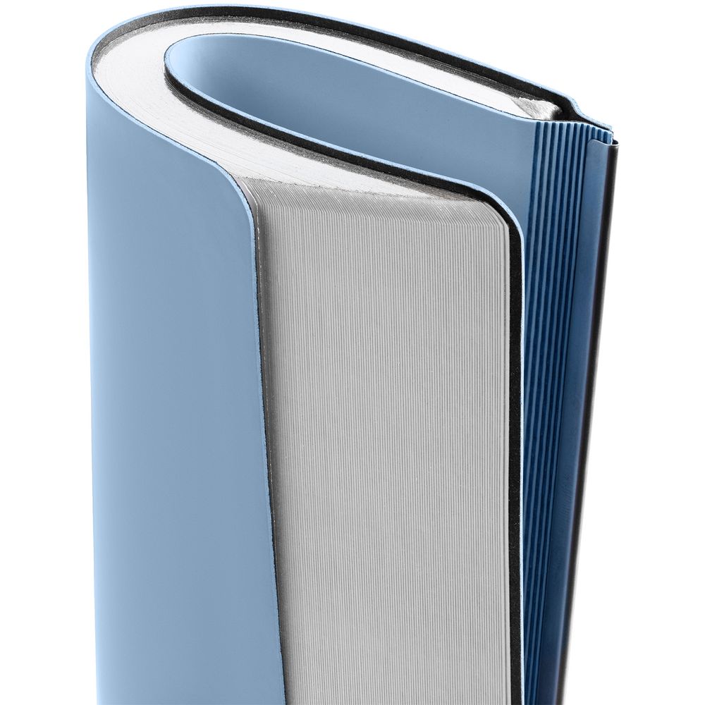 Ежедневник с гибкой обложкой и металлическим корешком, выполнен из материала Soft Touch, голубой JJ, дополнен серебристым обрезом блока и ляссе.