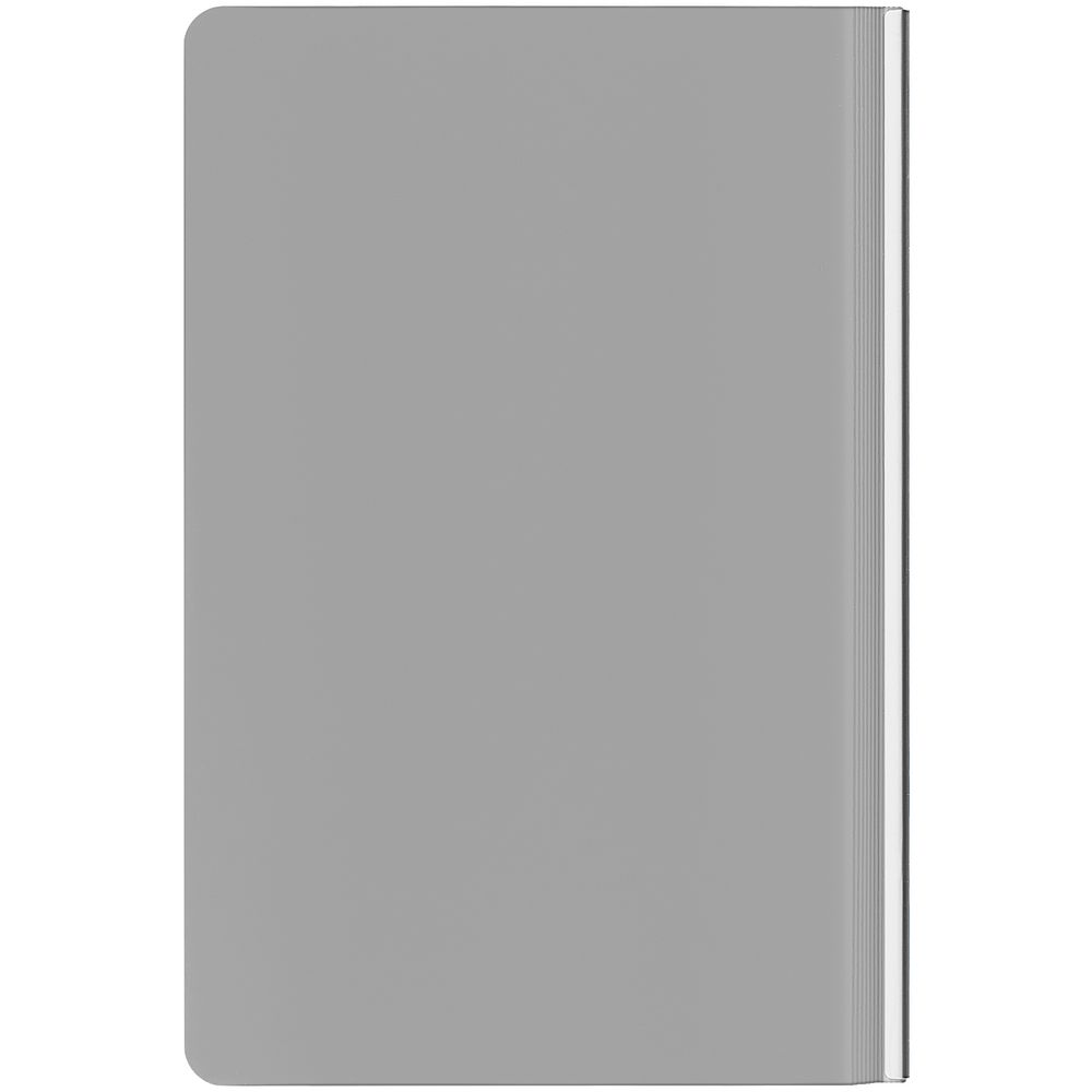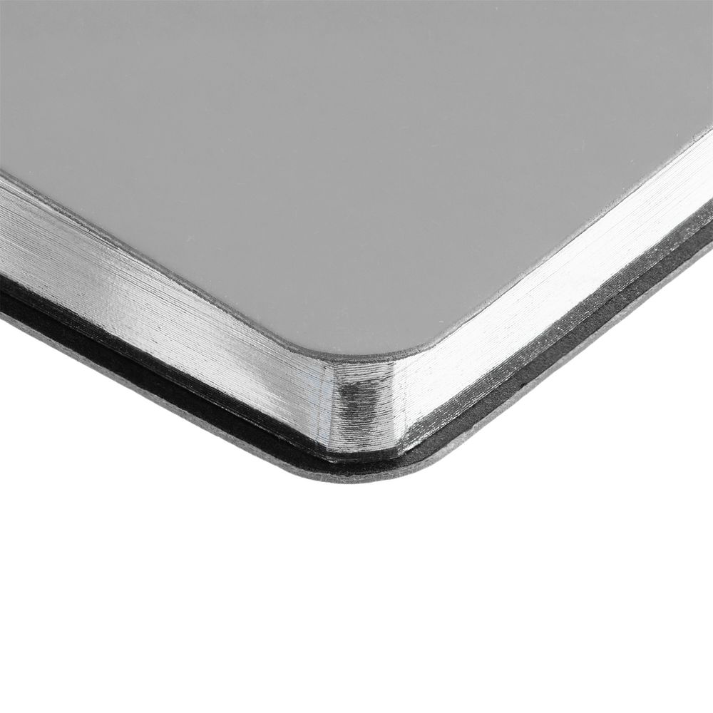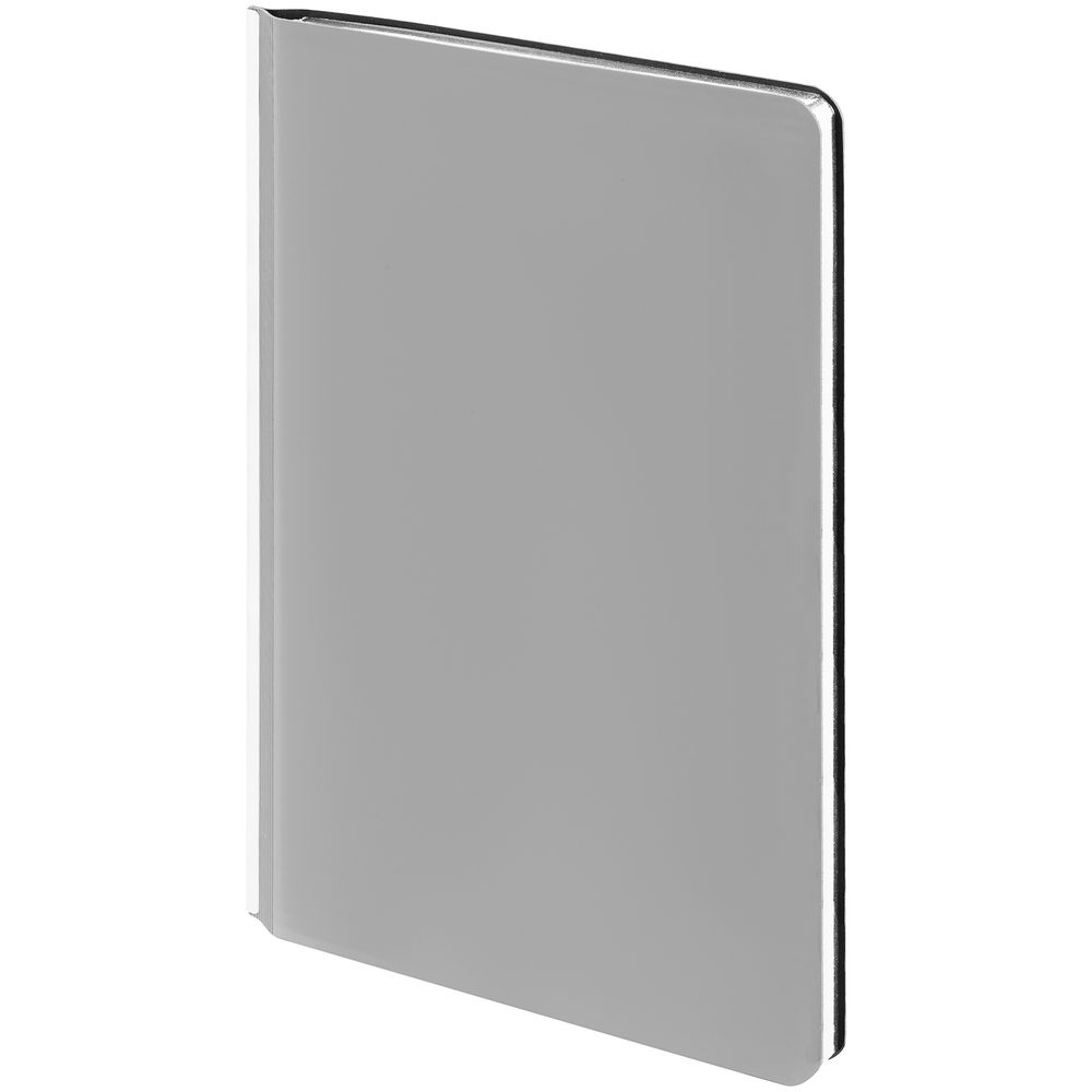 Зауженный ежедневник с гибкой обложкой и металлическим корешком, выполнен из материала Soft Touch, серый СС, дополнен серебристым обрезом блока и ляссе.