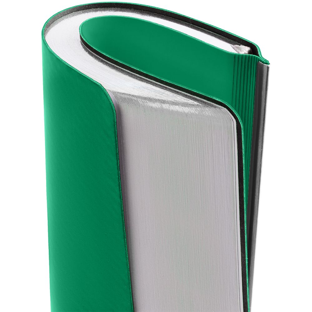 Ежедневник с гибкой обложкой и металлическим корешком, выполнен из материала Soft Touch Ultra, зеленый FF, дополнен серебристым обрезом блока и ляссе.
