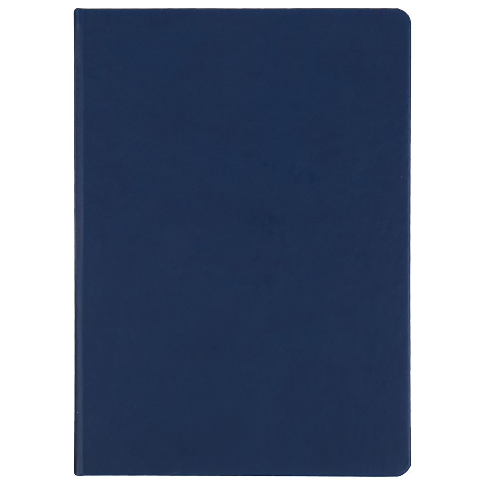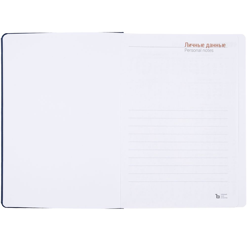 Ежедневник с твердой обложкой, выполнен из материала Latte, темно-синий XX, дополнен ляссе в цвет обложки.