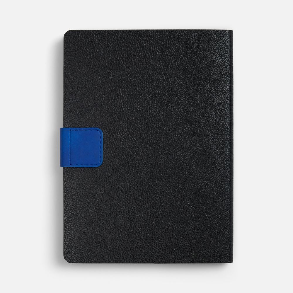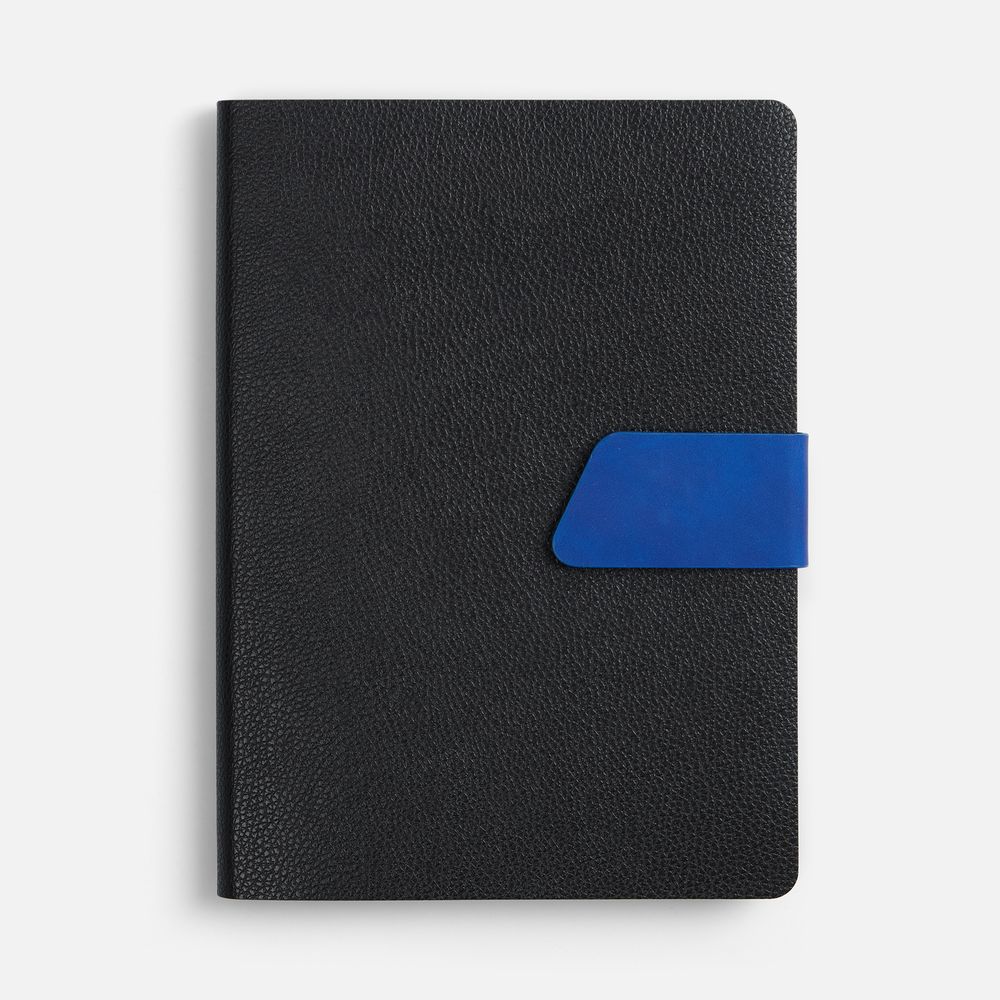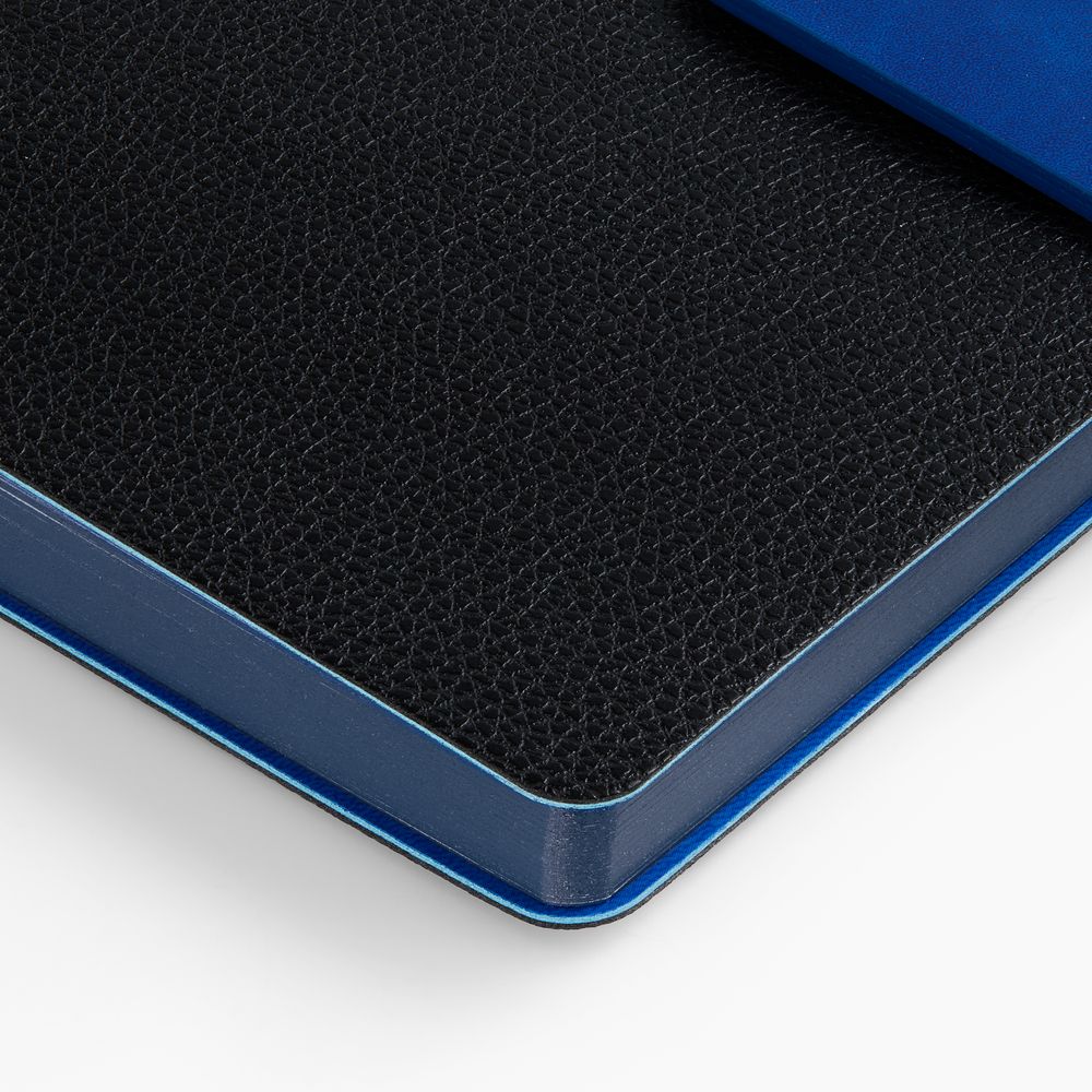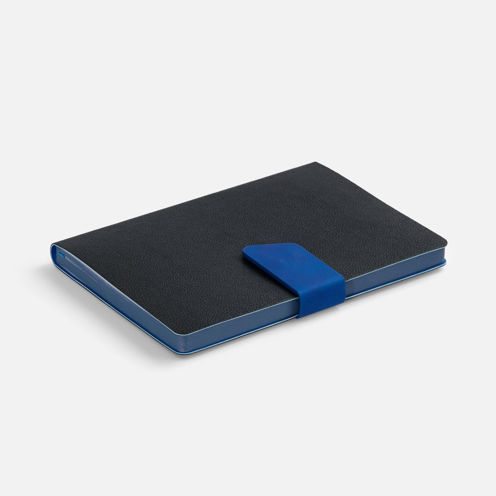Ежедневник с гибкой обложкой, выполнен из материала La Fite, черный АА и Nubuck Touch, синий, дополнен синим ляссе и хлястиком на кнопке.