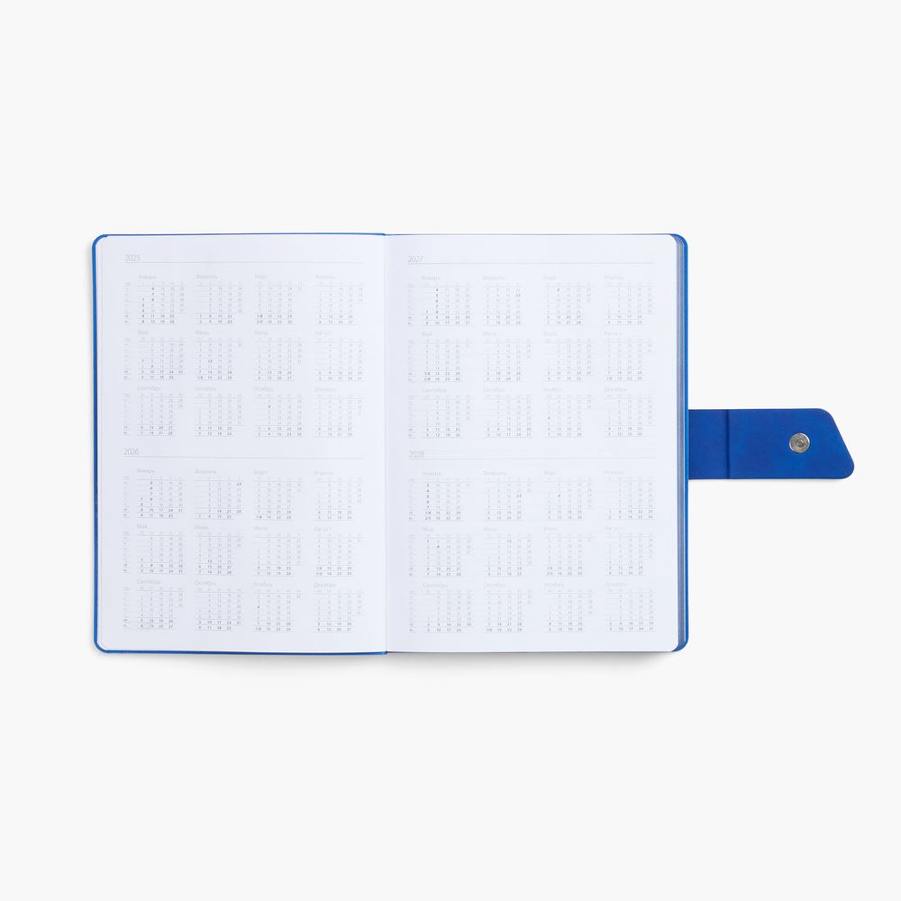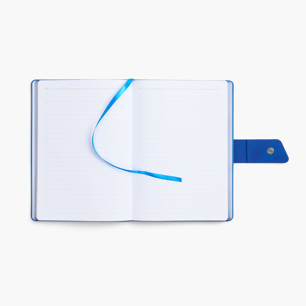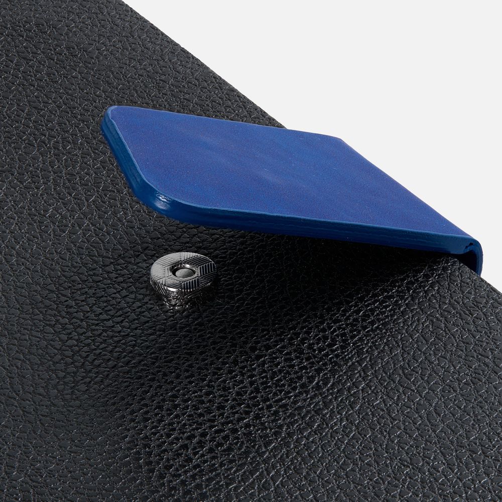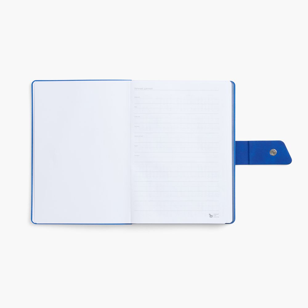Ежедневник с гибкой обложкой, выполнен из материала La Fite, черный АА и Nubuck Touch, синий, дополнен синим ляссе и хлястиком на кнопке.