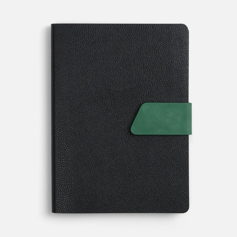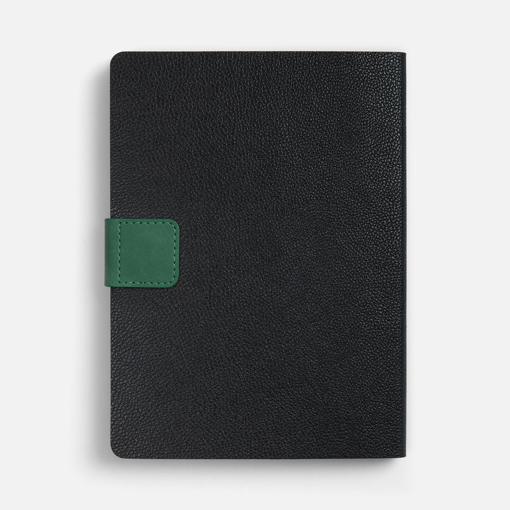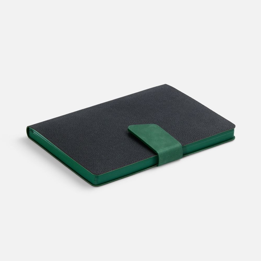 Ежедневник с гибкой обложкой, выполнен из материала La Fite, черный АА и NubuckTouch, зелёный, дополнен зеленым ляссе и хлястиком на кнопке.