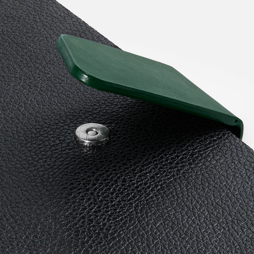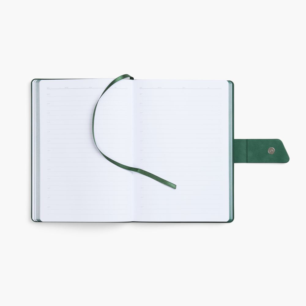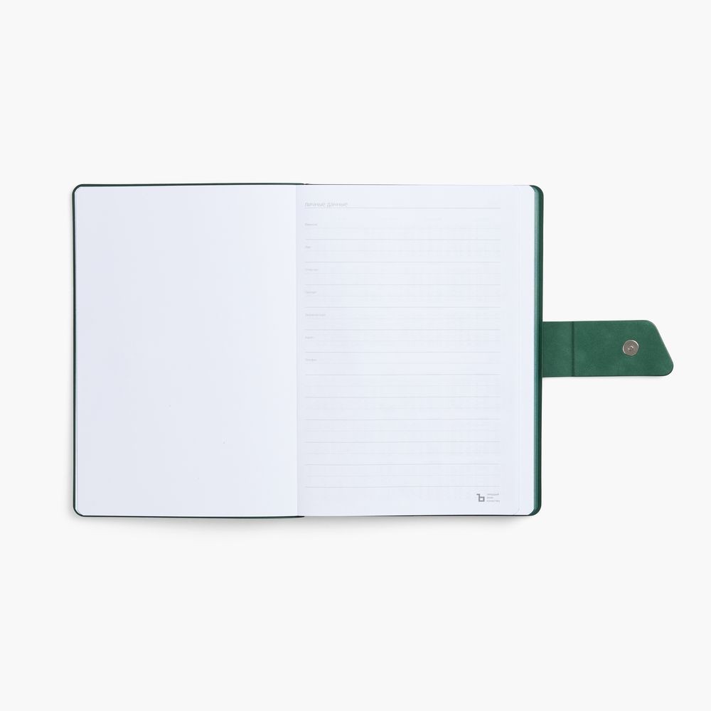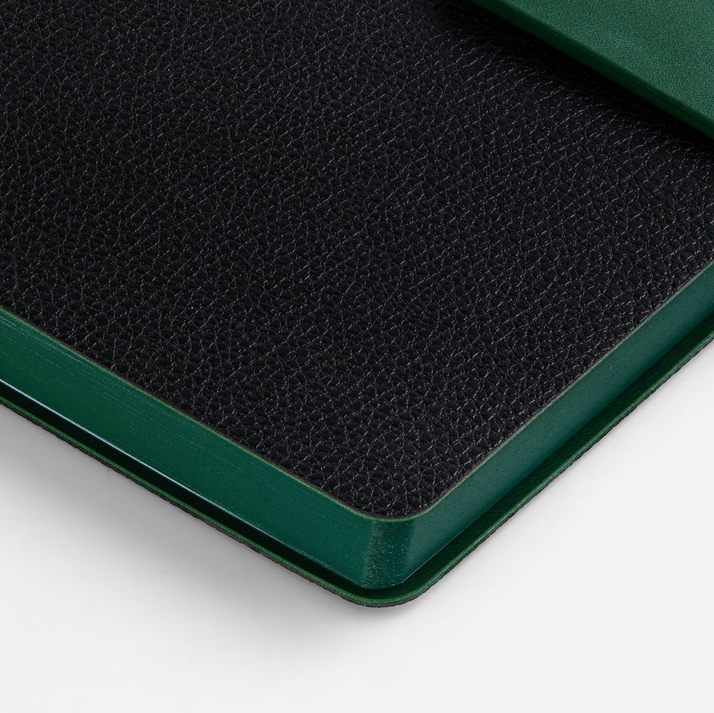 Ежедневник с гибкой обложкой, выполнен из материала La Fite, черный АА и NubuckTouch, зелёный, дополнен зеленым ляссе и хлястиком на кнопке.