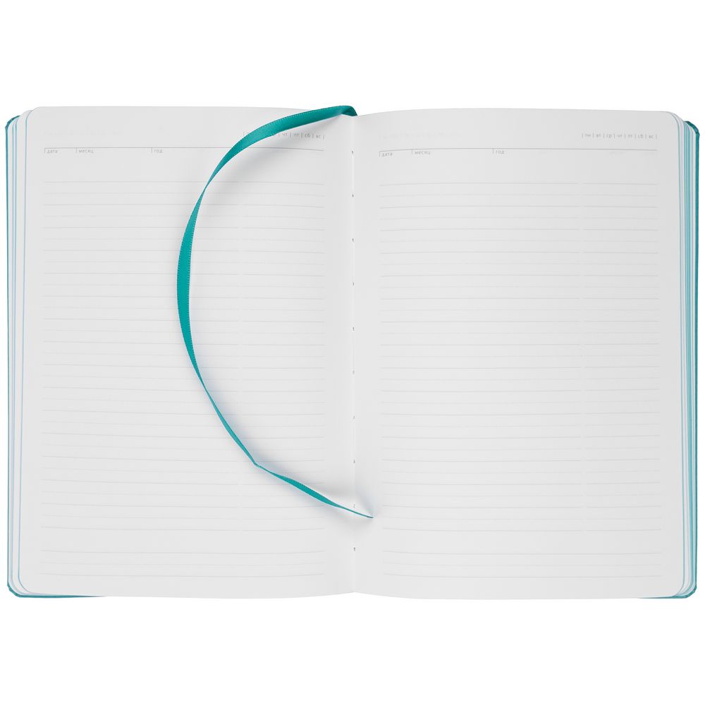Ежедневник с твердой обложкой и тонированным обрезом. Выполнен из материала Latte, бирюзовый, дополнен ляссе в цвет обложки.