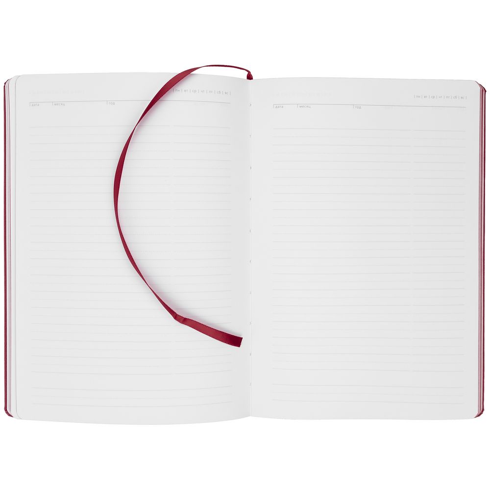 Ежедневник с твердой обложкой и тонированным обрезом. Выполнен из материала Latte, бордовый, дополнен ляссе в цвет обложки.