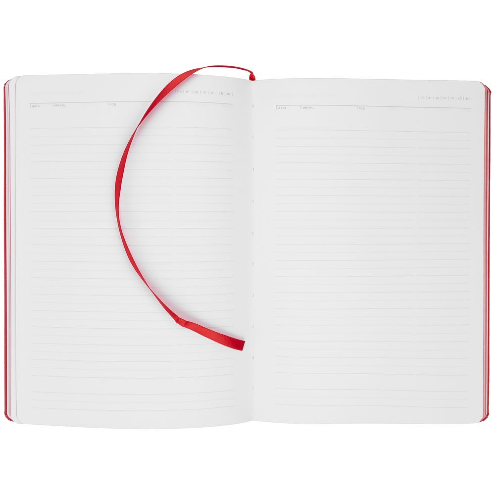 Ежедневник с твердой обложкой и тонированным обрезом. Выполнен из материала Latte, красный, дополнен ляссе в цвет обложки.