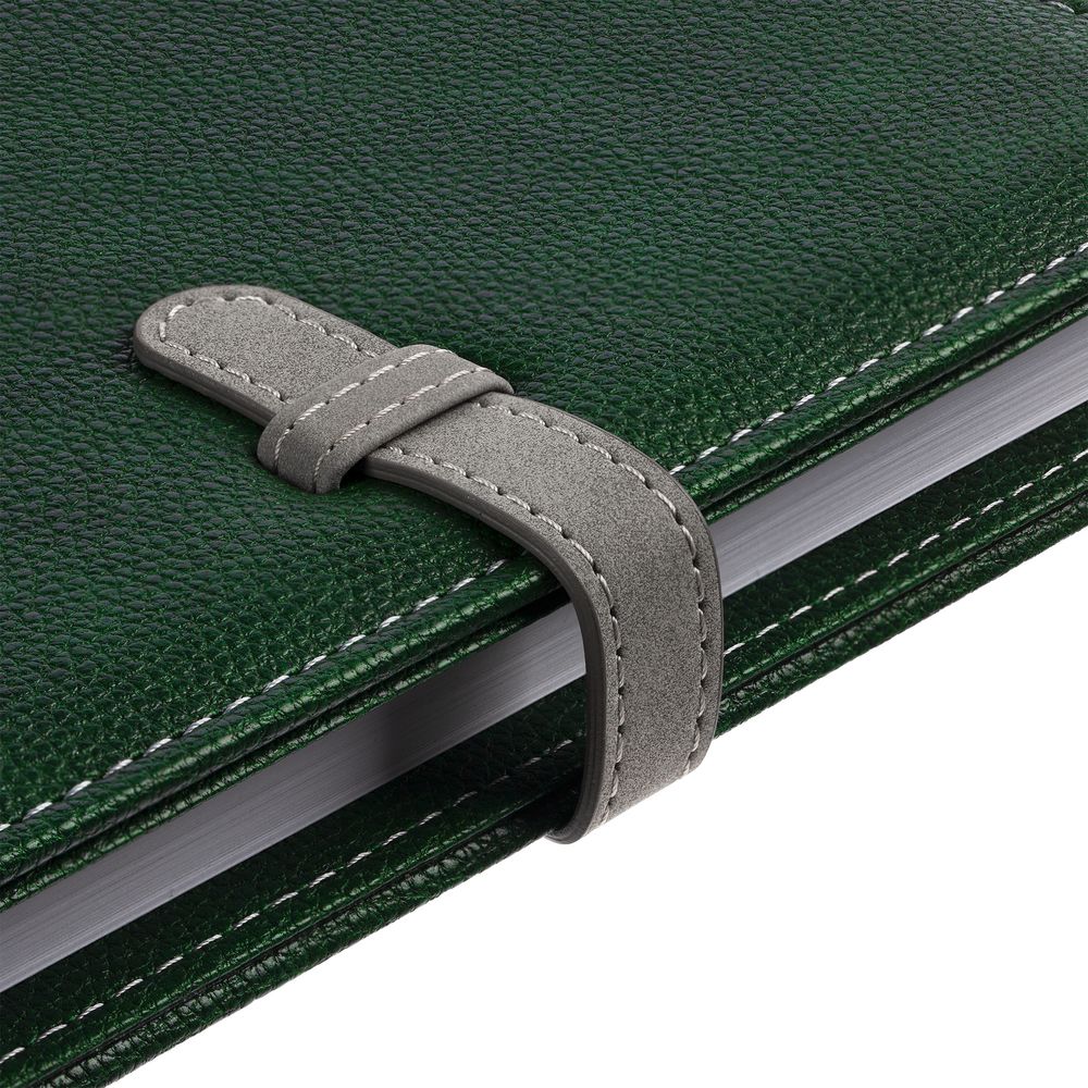 Ежедневник в мягкой суперобложке, выполнен из материала La Fite, зеленый FF, дополнен ляссе серого цвета.