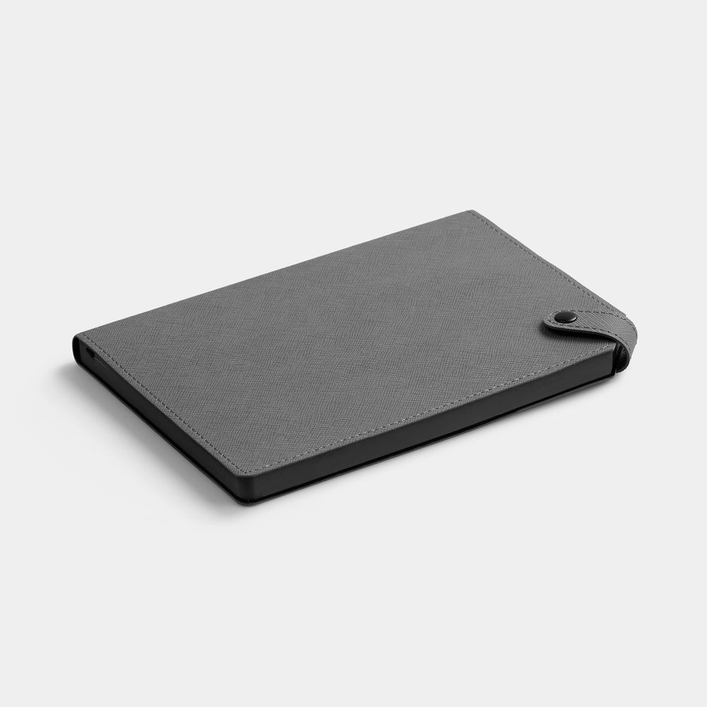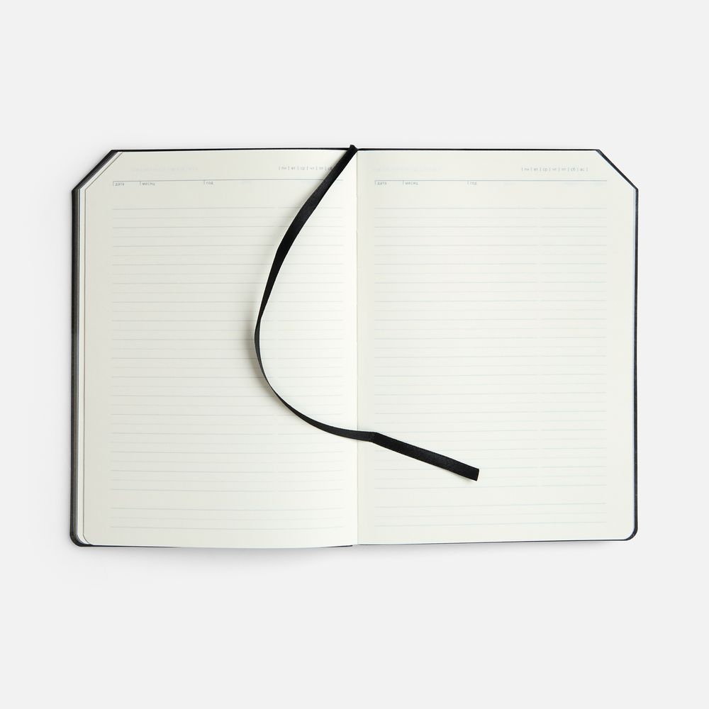 Ежедневник с гибкой обложкой, выполнен из материала Espresso, дополнен ляссе черного цвета и хлястиком на кнопке.