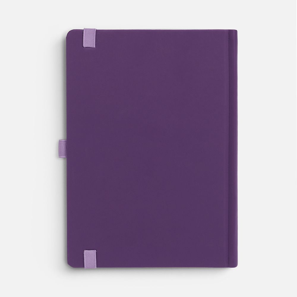 Ежедневник с твердой обложкой без поролона, выполнен из материала Soft Touch, фиолетовый UU, дополнен резинкой шириной 1 см, петлей-резинкой для ручки, капталом и ляссе в цвет обложки.