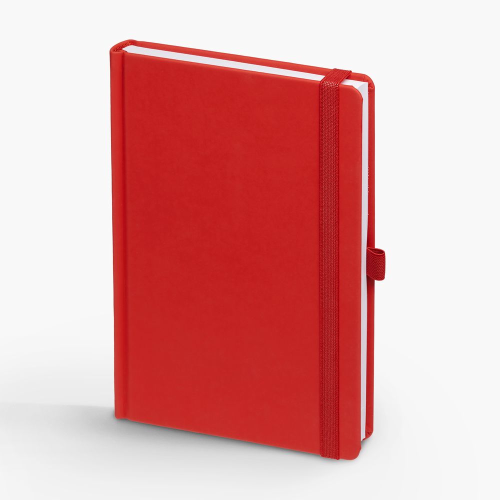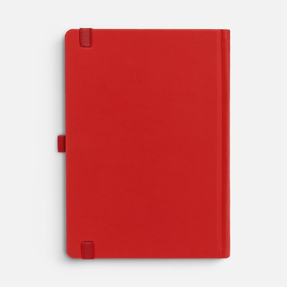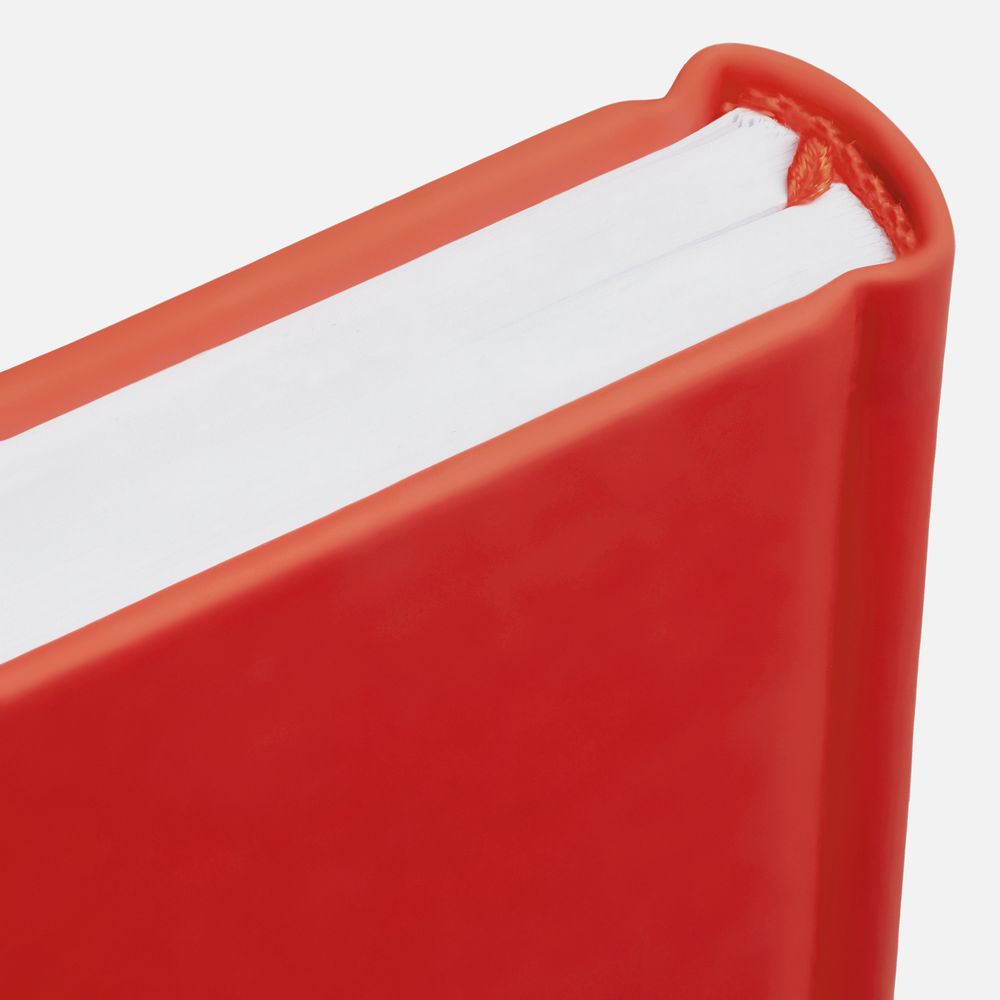 Ежедневник с твердой обложкой без поролона, выполнен из материала Soft Touch Ultra, красный РР, дополнен резинкой шириной 1 см, петлей-резинкой для ручки, капталом и ляссе красного цвета.
