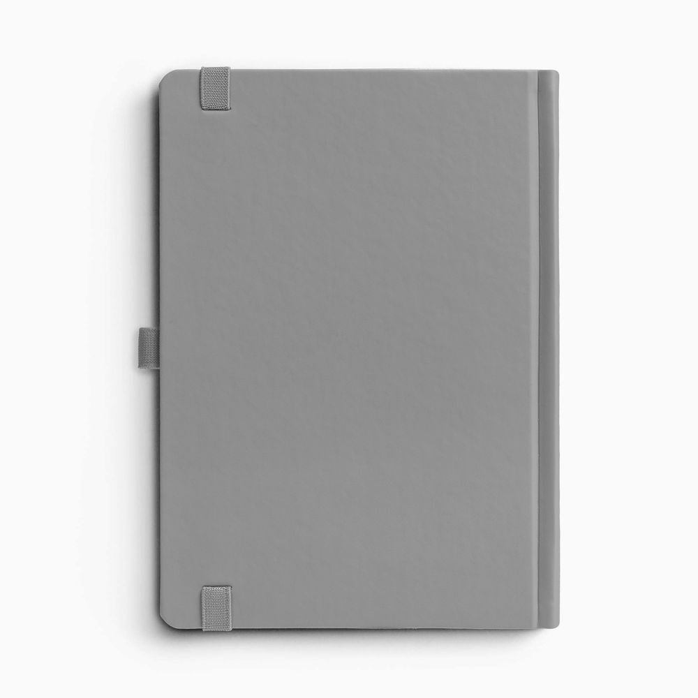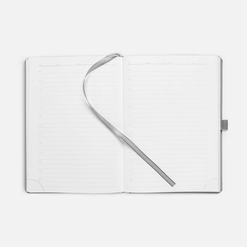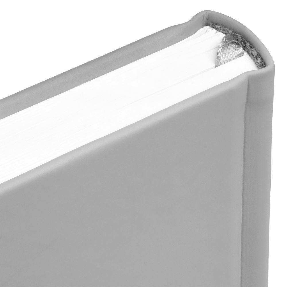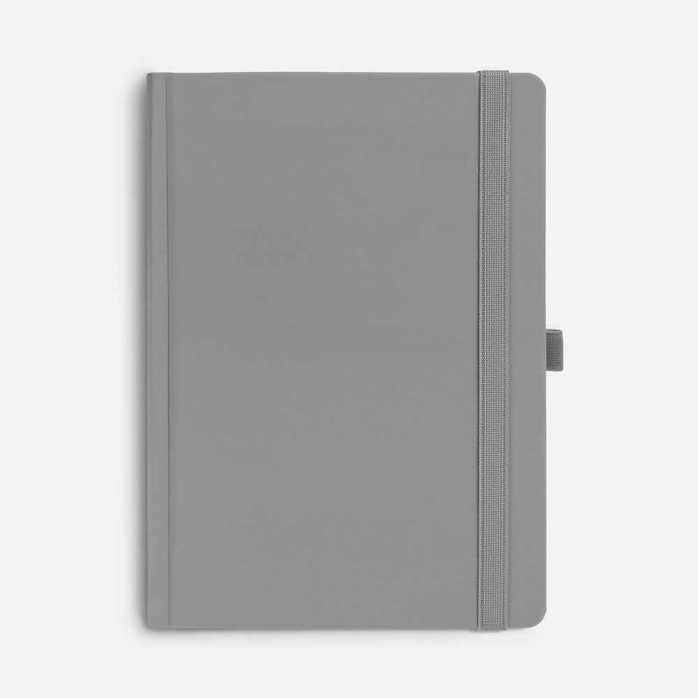 Ежедневник с твердой обложкой без поролона, выполнен из материала Soft Touch, серый СС, дополнен резинкой шириной 1 см, петлей-резинкой для ручки, капталом и ляссе серого цвета.