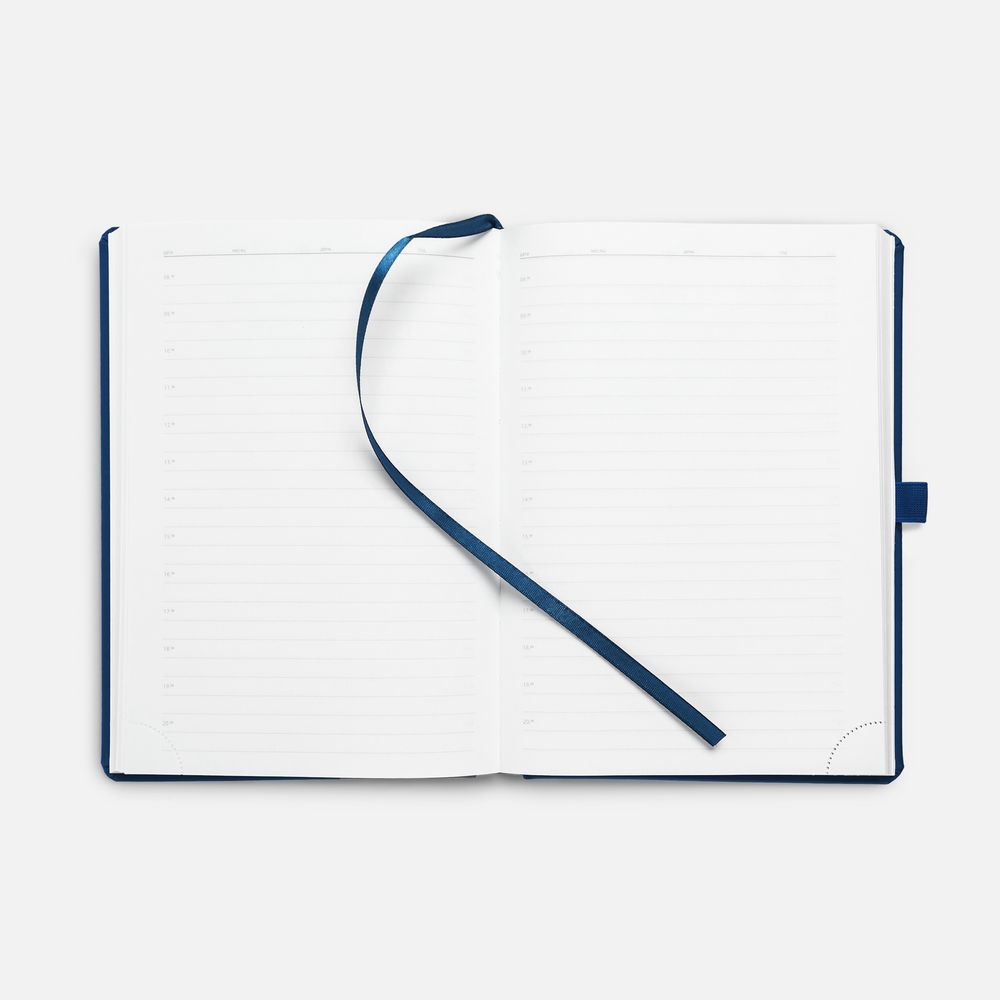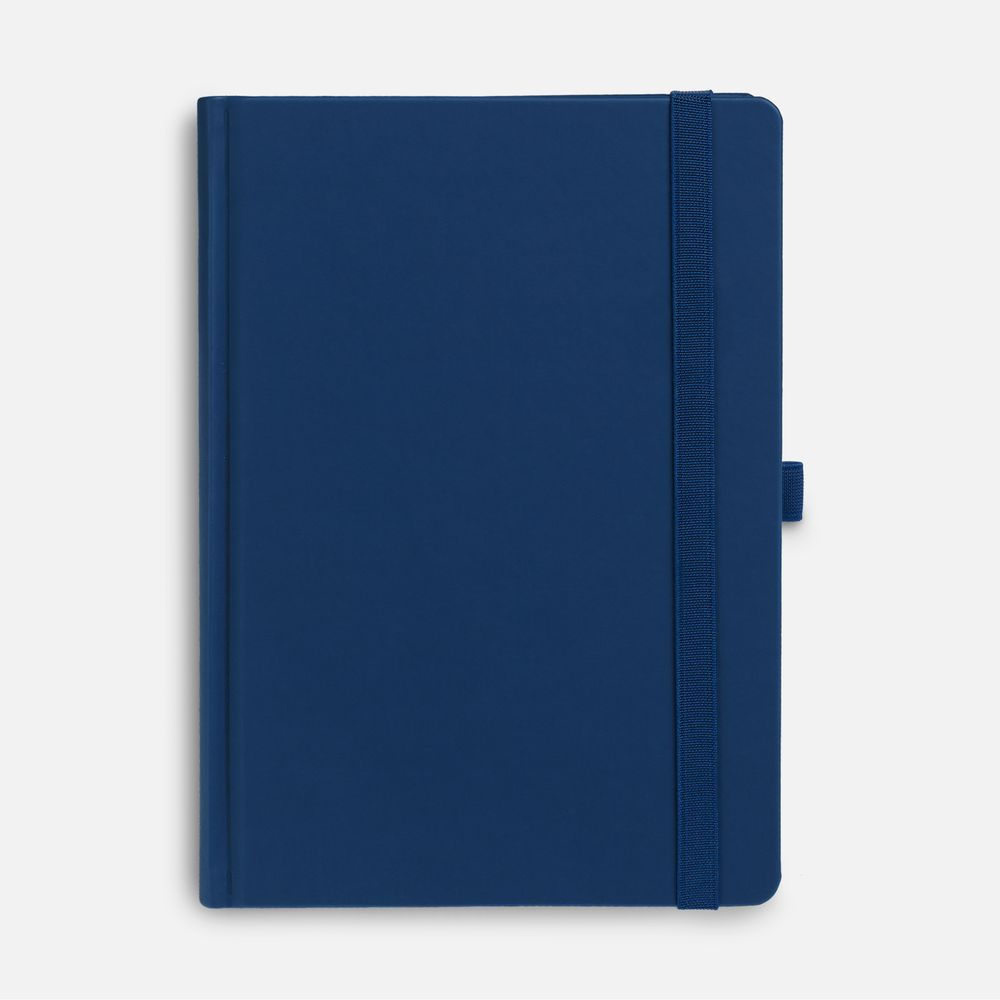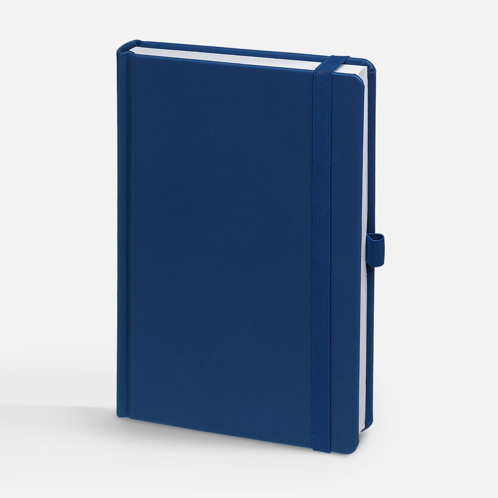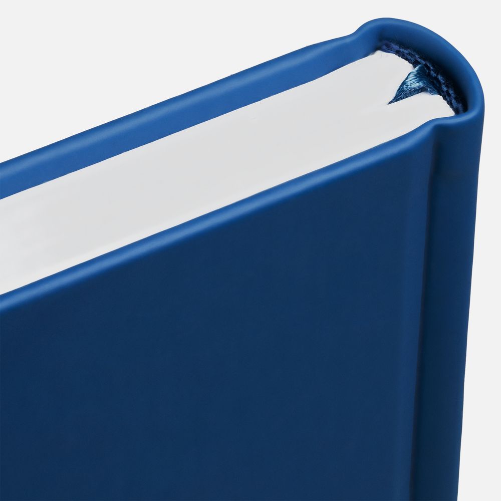 Ежедневник с твердой обложкой без поролона, выполнен из материала Soft Touch Ultra, синий НН, дополнен резинкой шириной 1 см, петлей-резинкой для ручки, капталом и ляссе синего цвета.