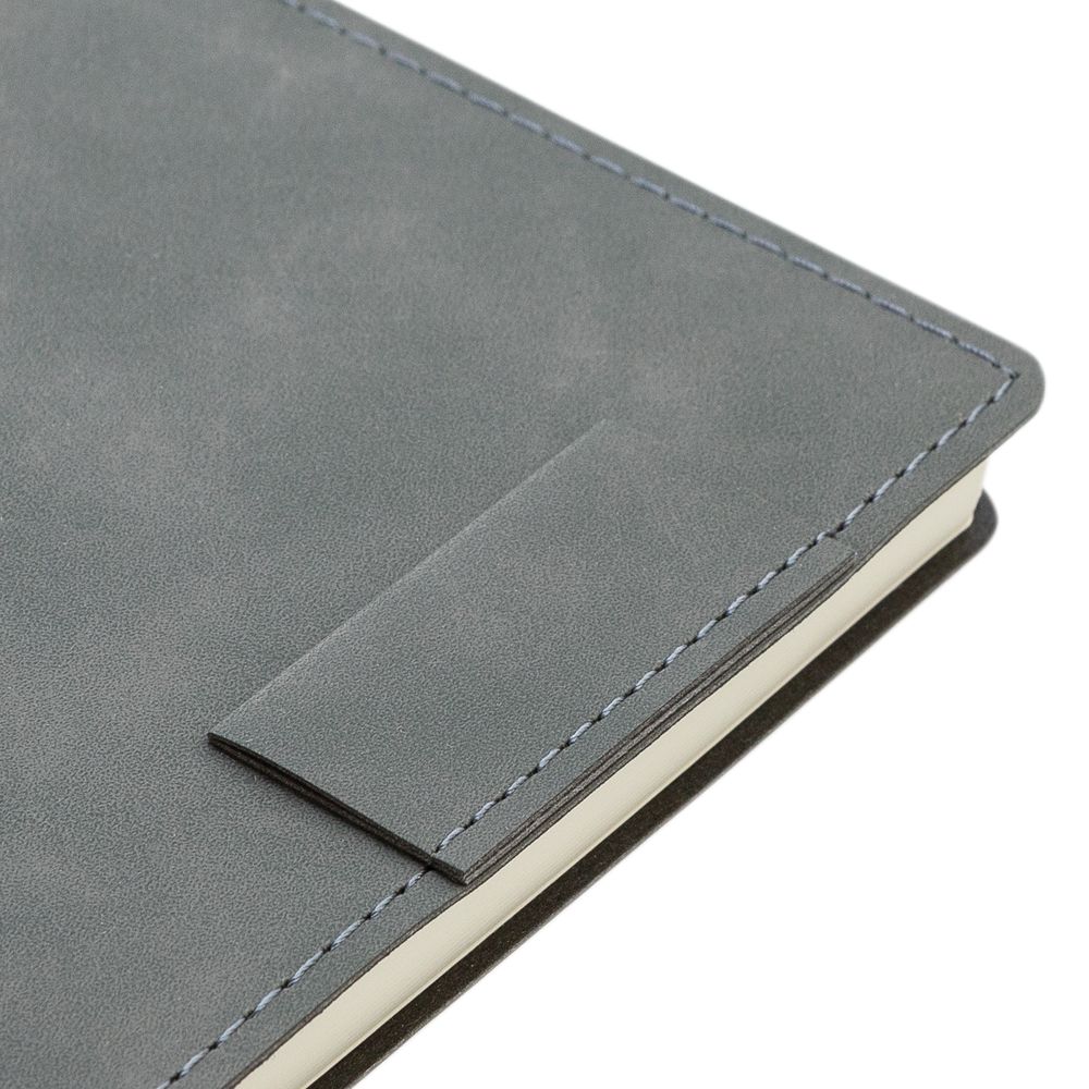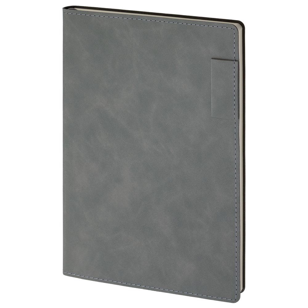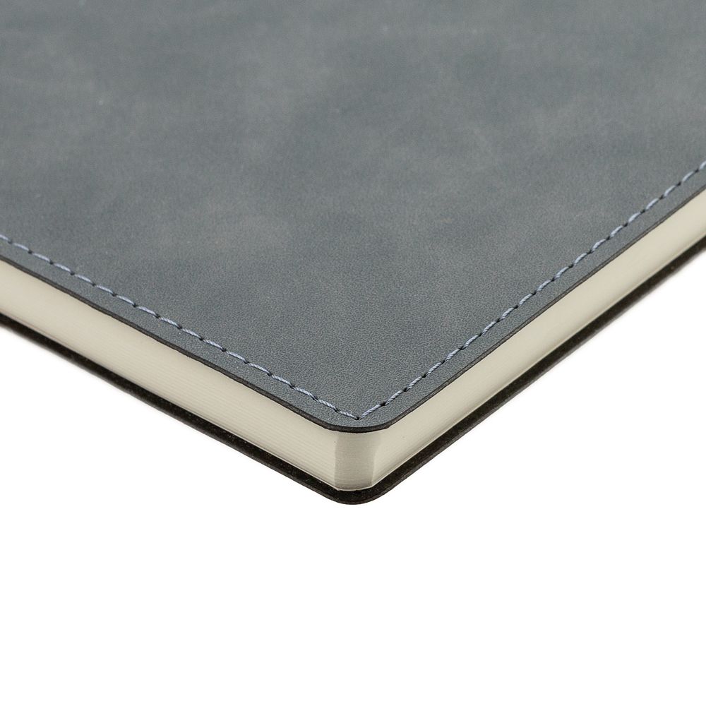 Ежедневник 17х24 см, с гибкой обложкой, выполнен из материала Nubuck Touch, темно-серый ЕЕ, дополнен петлей-лейблом для ручки и двойным ляссе в цвет материала.