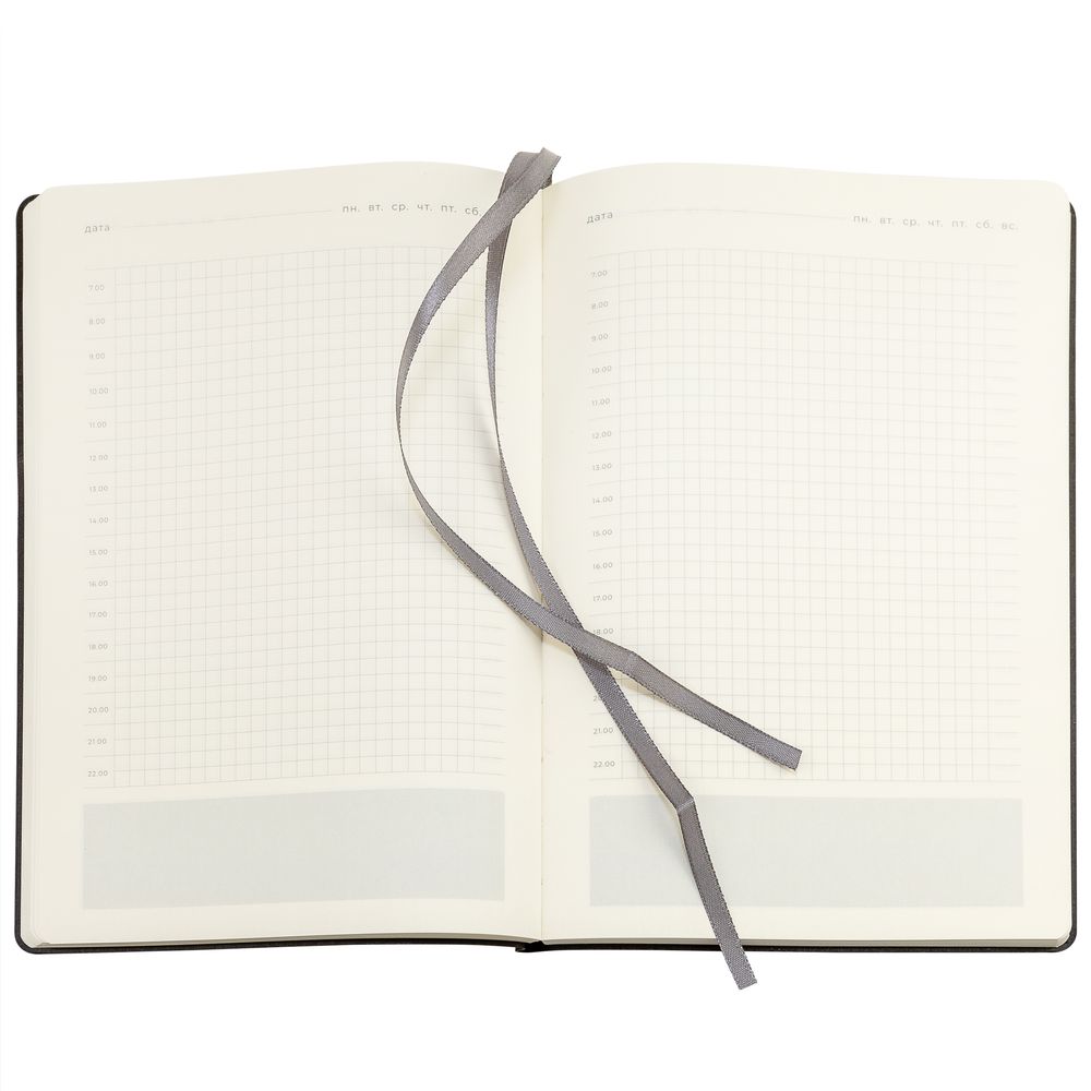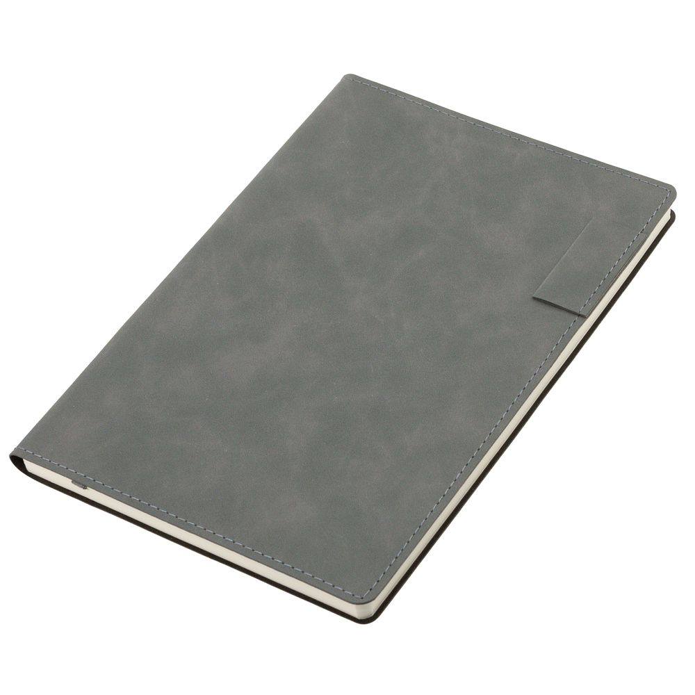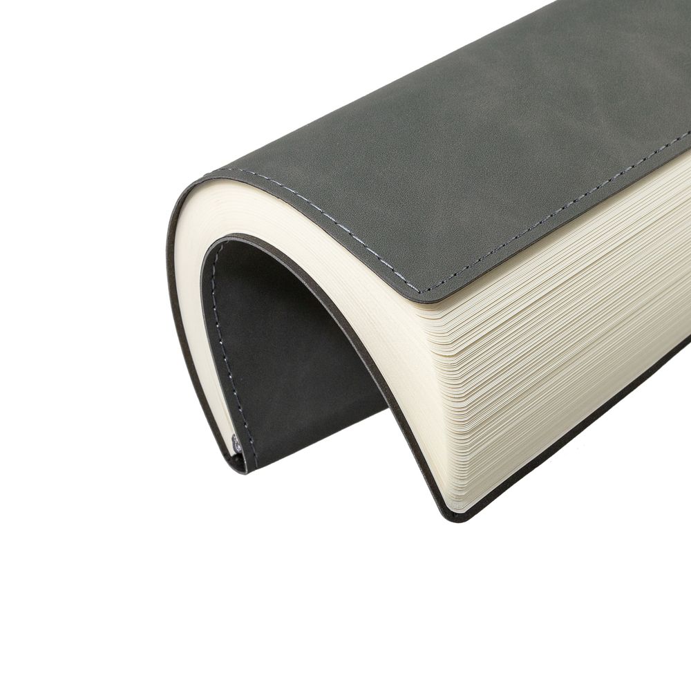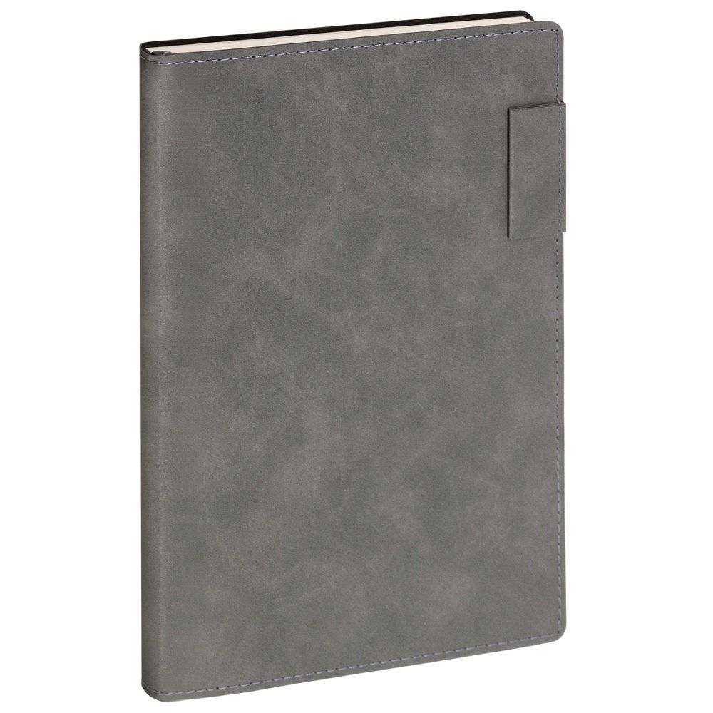 Ежедневник 17х24 см, с гибкой обложкой, выполнен из материала Nubuck Touch, темно-серый ЕЕ, дополнен петлей-лейблом для ручки и двойным ляссе в цвет материала.