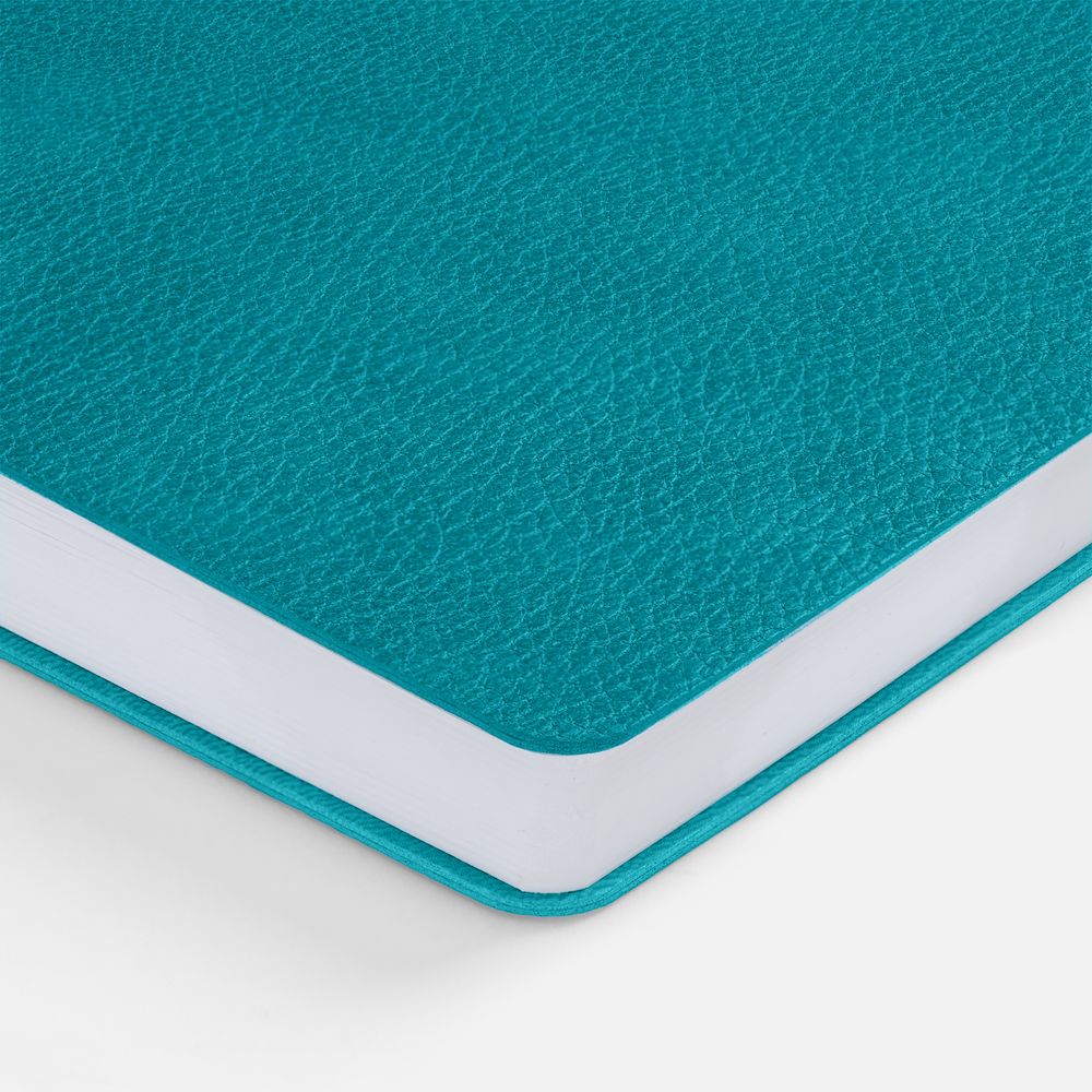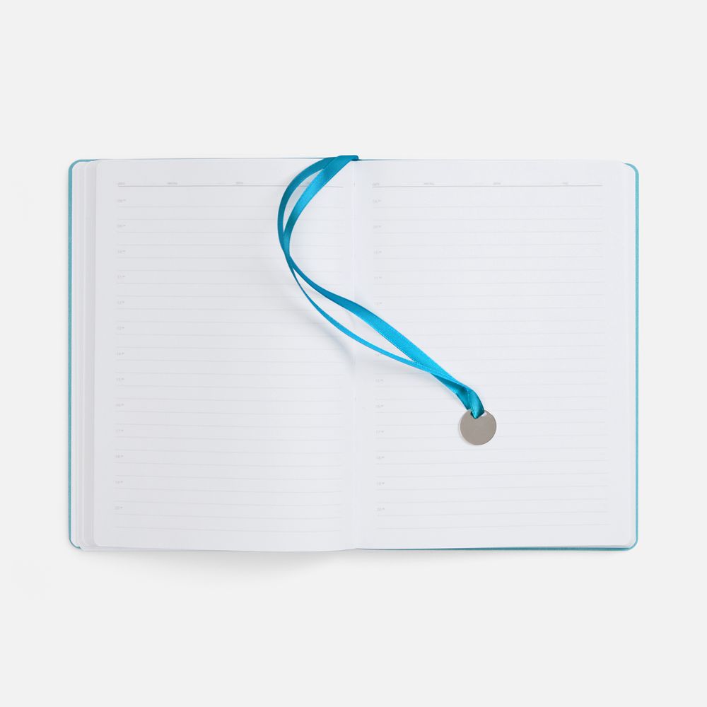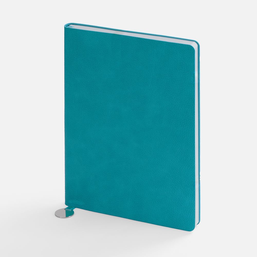 Ежедневник с гибкой обложкой, выполнен из материал La Fite, цвет морской волны II, дополнен ляссе в цвет обложки с металлическим шильдом.
