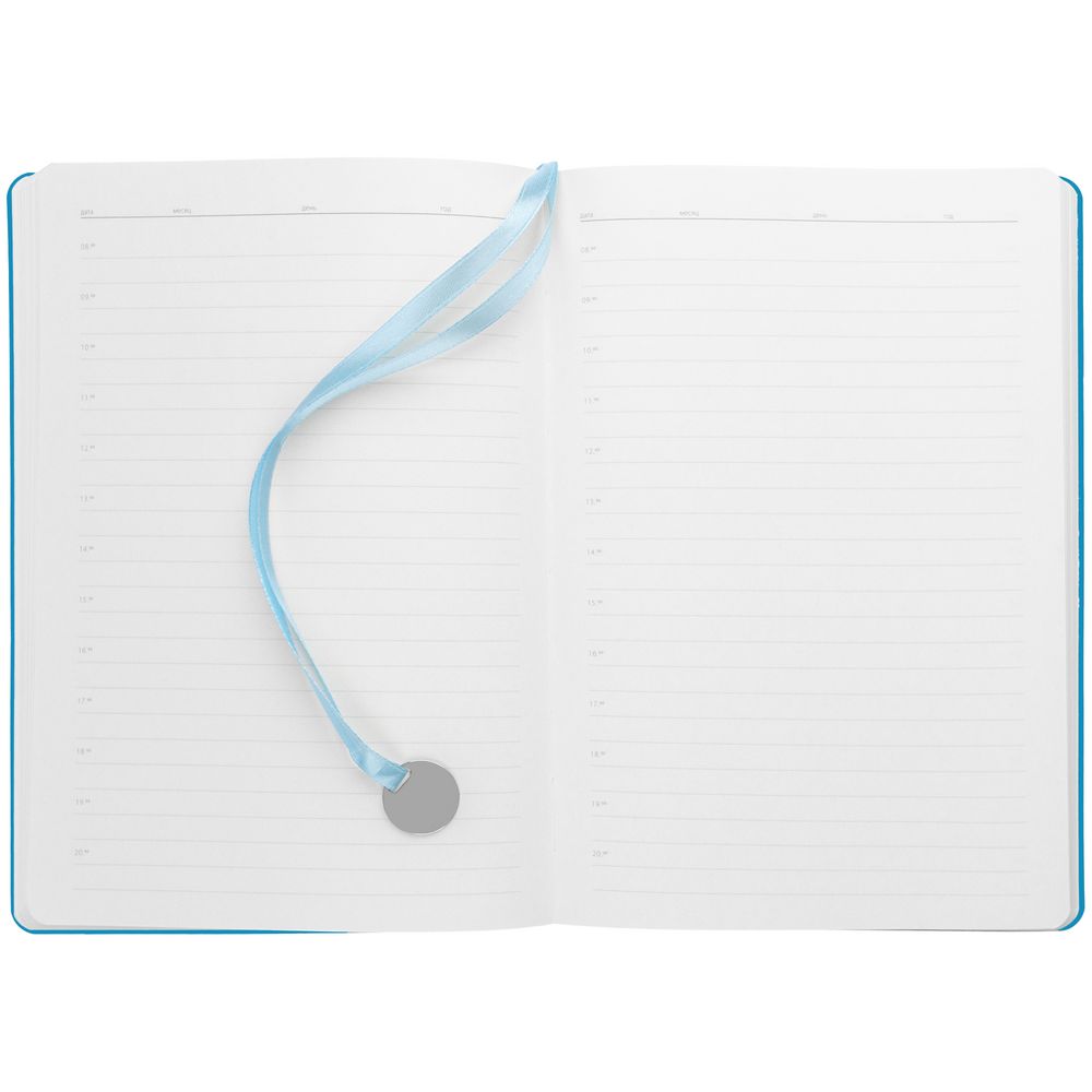 Ежедневник с гибкой обложкой, выполнен из материал La Fite, голубой JJ, дополнен ляссе в цвет обложки с металлическим шильдом.