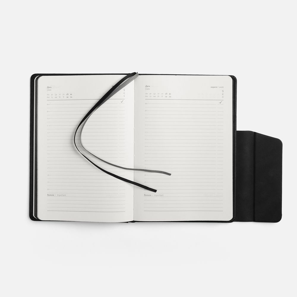 Ежедневник с твердой обложкой и фигурным магнитным клапаном, дополнен капталом и двойным ляссе.
