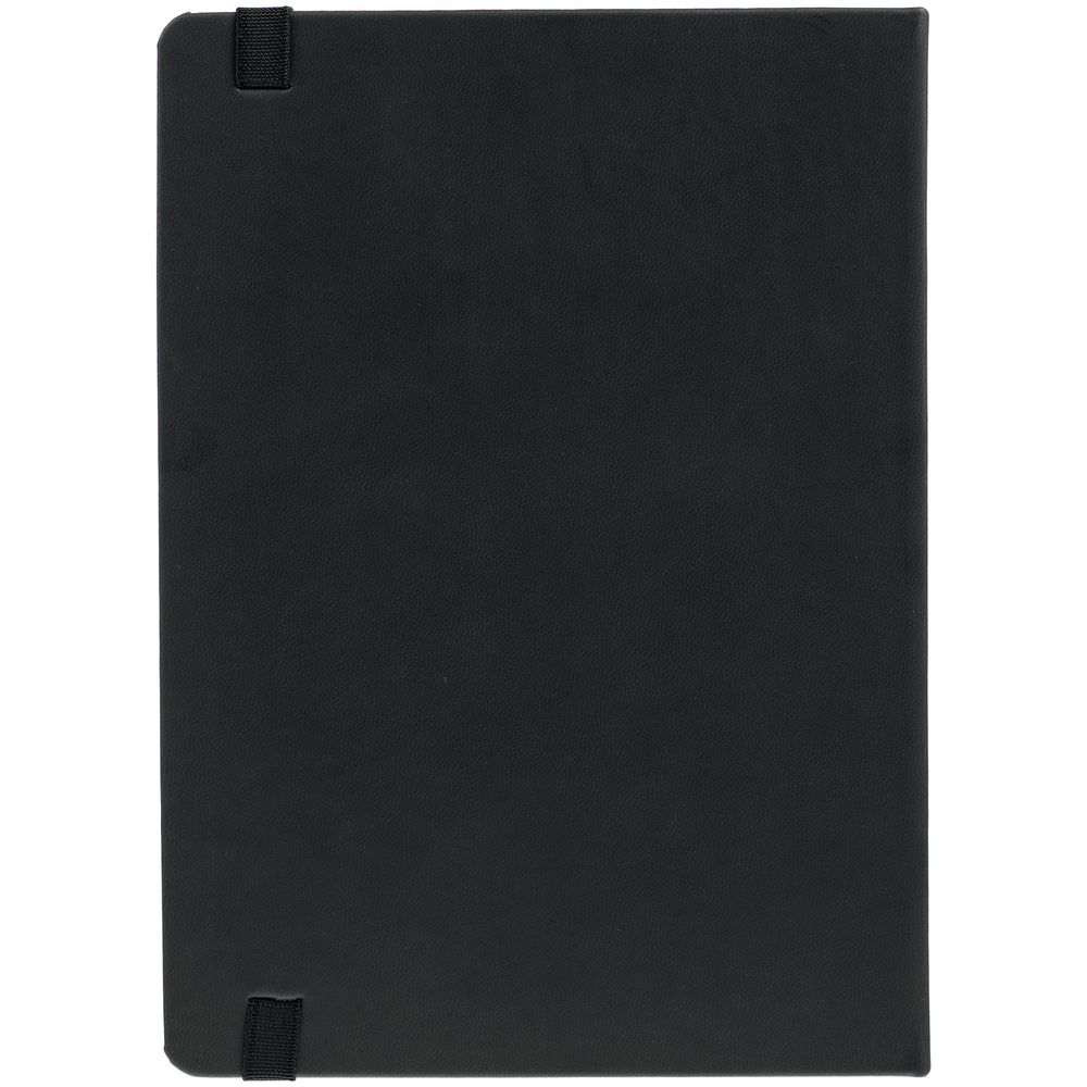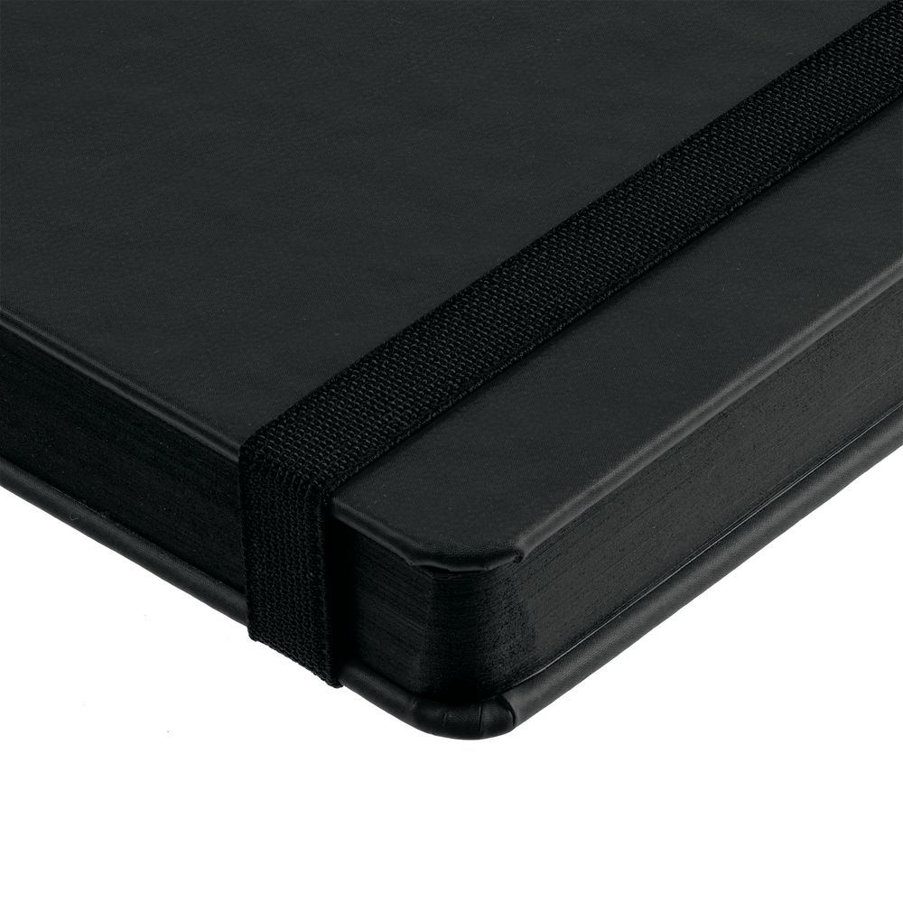 Ежедневник с твердой обложкой, выполнен из материала Latte, черный АА, обрез черного цвета, дополнен ляссе черного цвета и резинкой с металлическим шильдом.