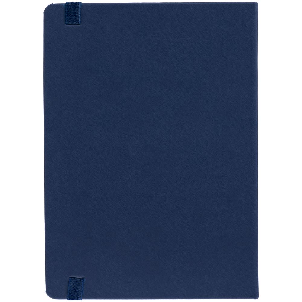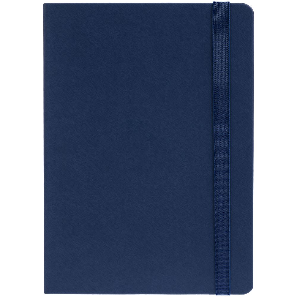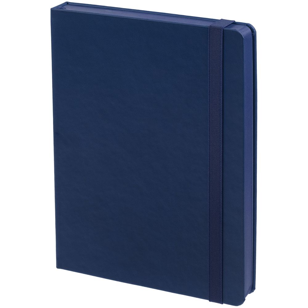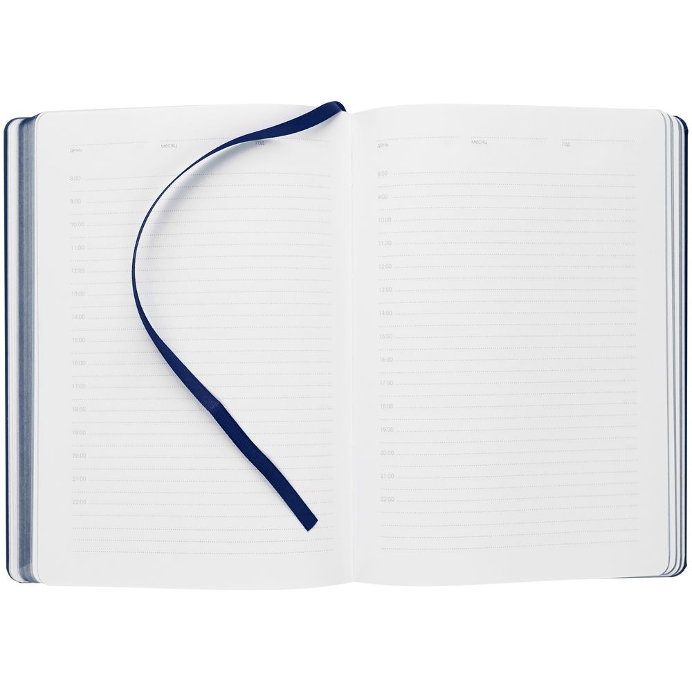 Ежедневник с твердой обложкой, выполнен из материала Latte, темно-синий ХХ, обрез темно-синего цвета, дополнен резинкой и ляссе темно-синего цвета.