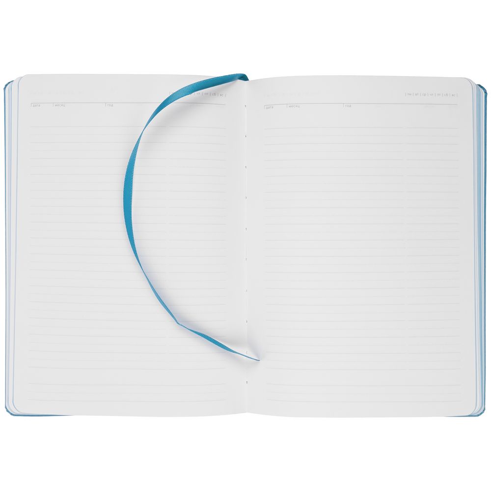 Ежедневник с твердой обложкой. Выполнен из материала Latte, голубой, дополнен ляссе в цвет обложки.