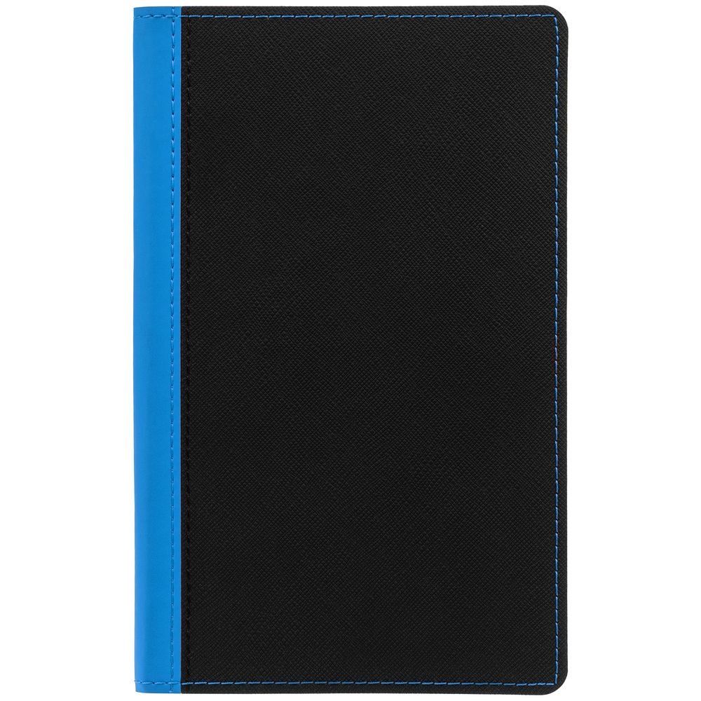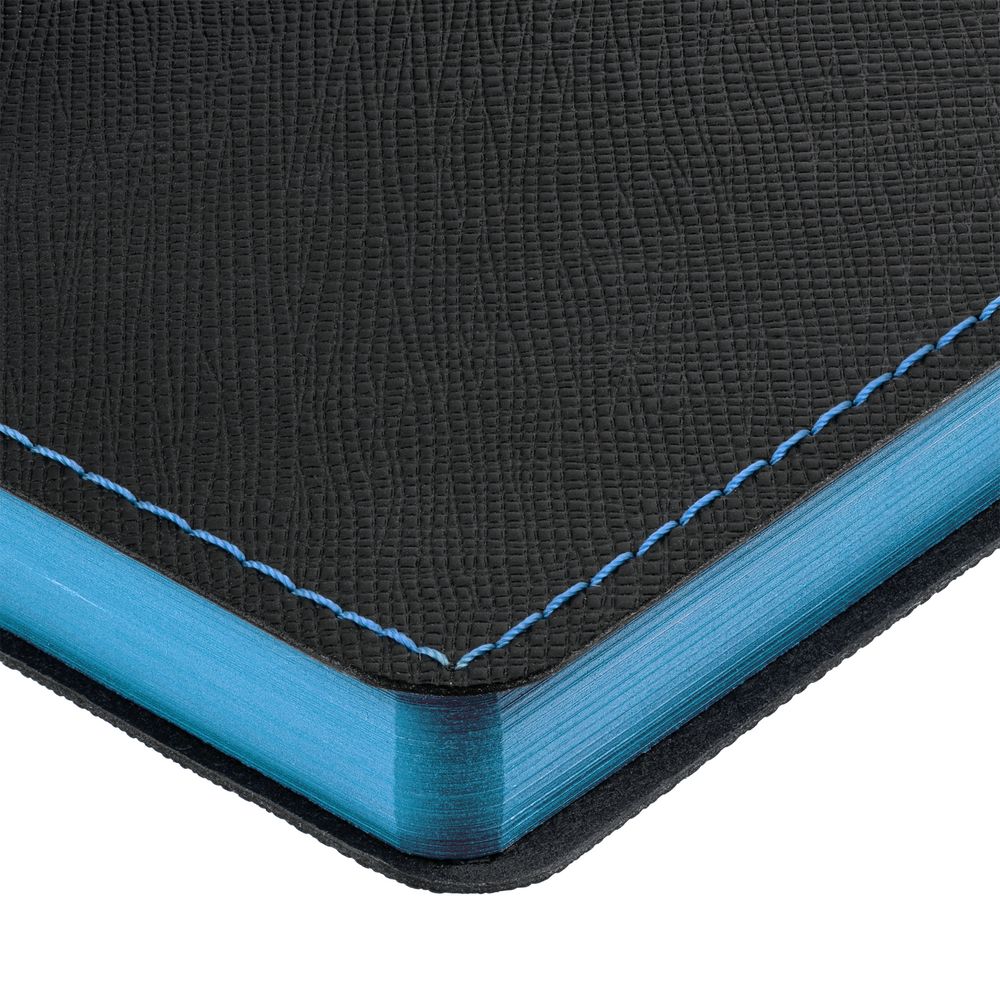 Ежедневник с гибкой обложкой выполнен из материала Nice Touch, черный АА и Soft Touch Ultra, голубой JJ, дополнен ляссе голубого цвета.