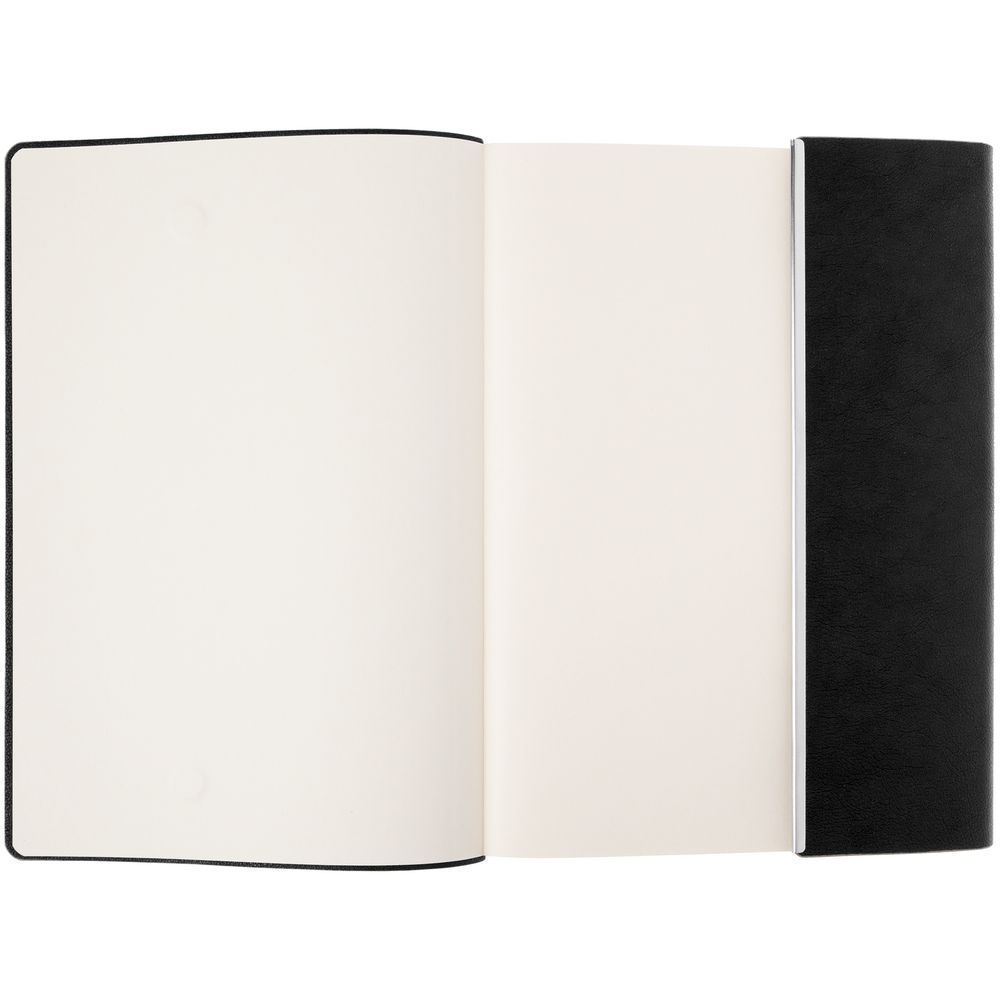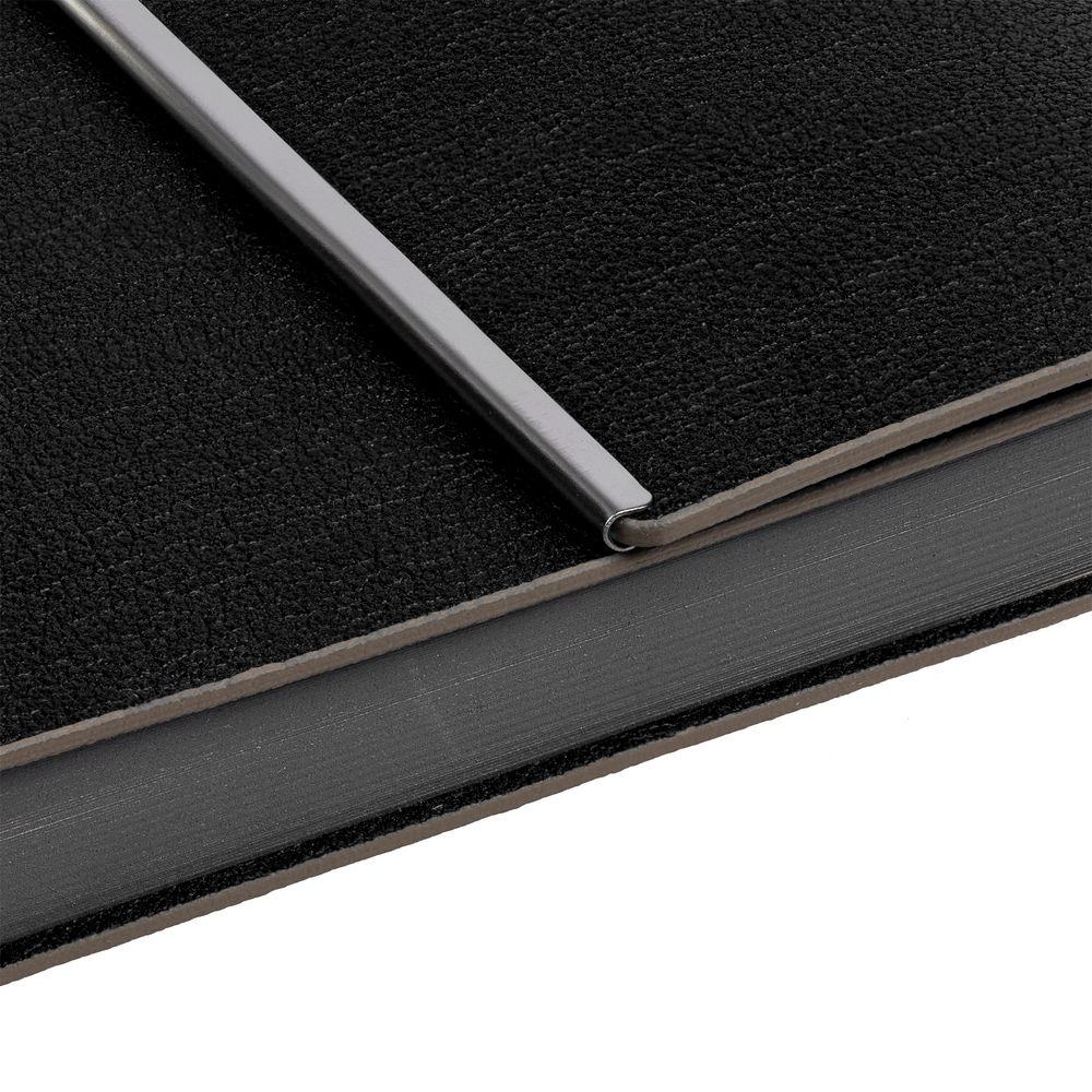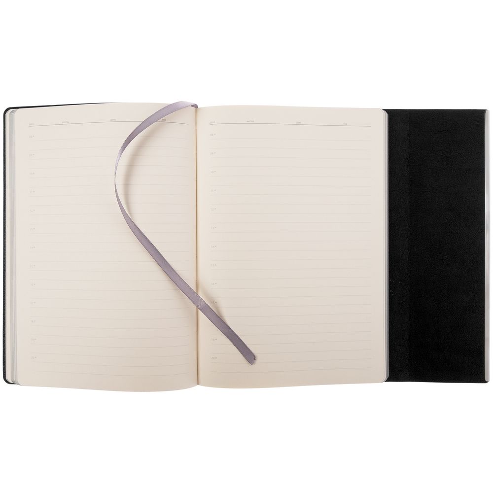 Ежедневник с гибкой обложкой, клапаном на магните и металлической отделкой клапана. Выполнен из материала Petrus, черный АА, дополнен серым ляссе.