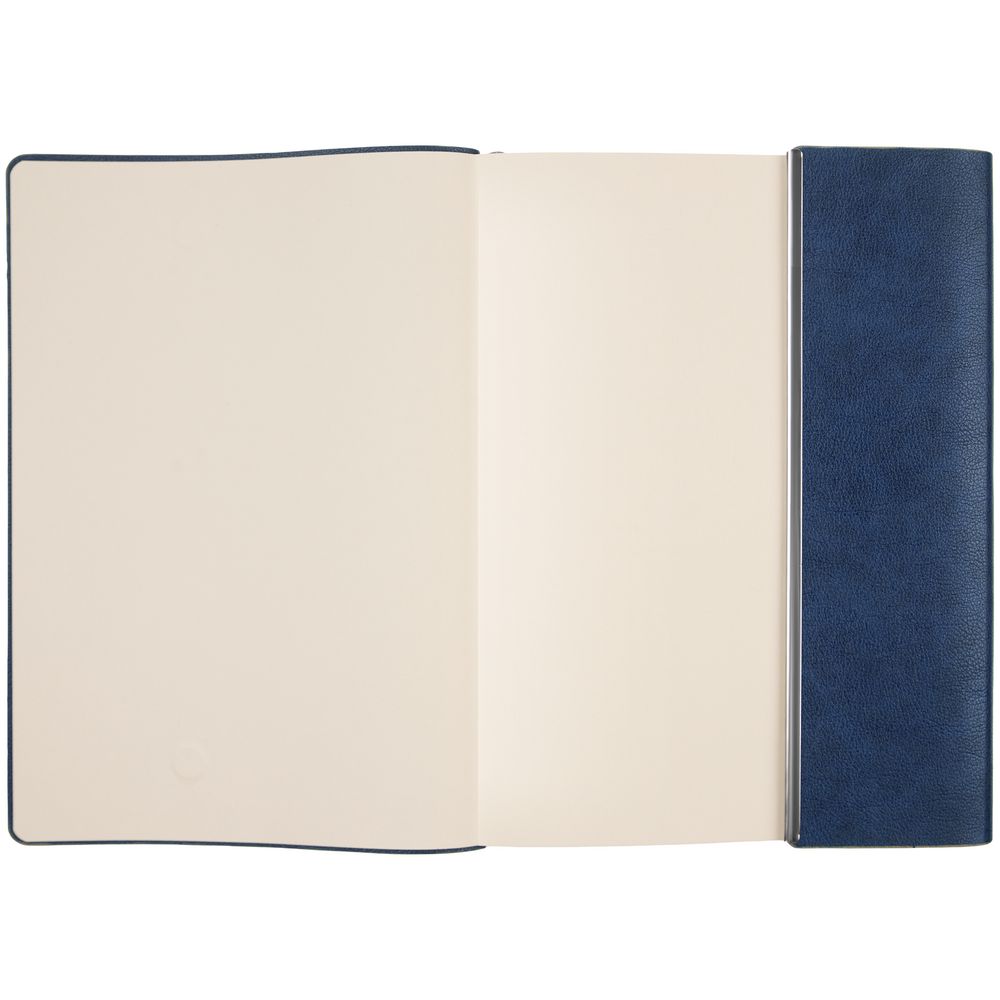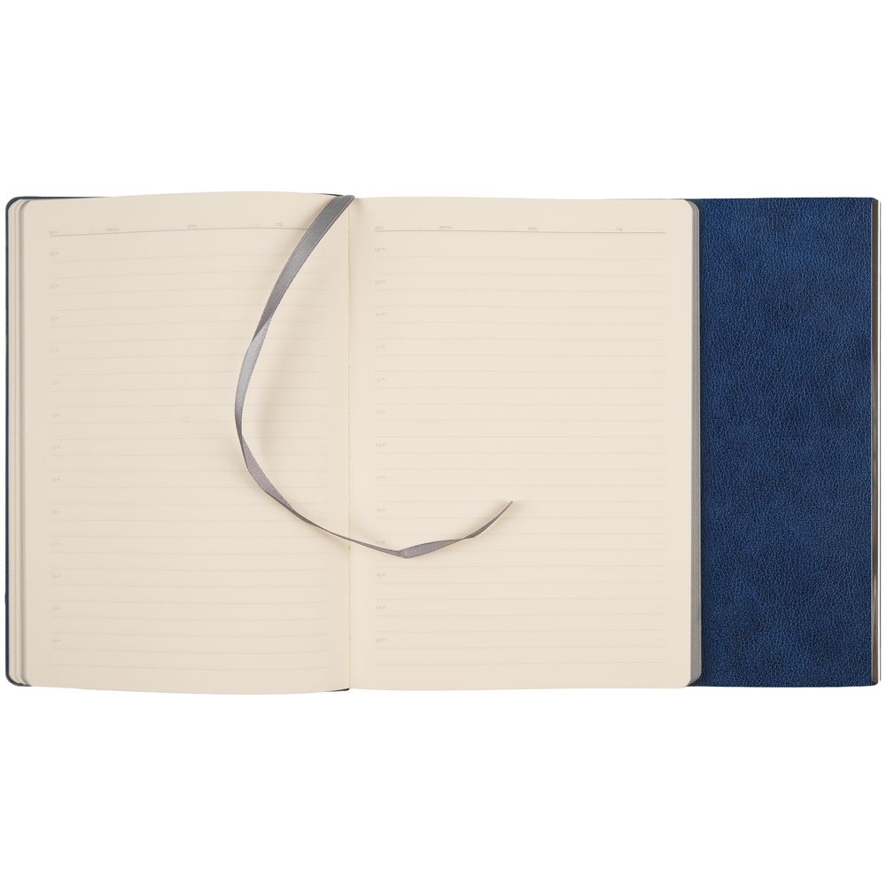 Ежедневник с гибкой обложкой, клапаном на магните и металлической отделкой клапана. Выполнен из материала Petrus, синий НН, дополнен серым ляссе.
