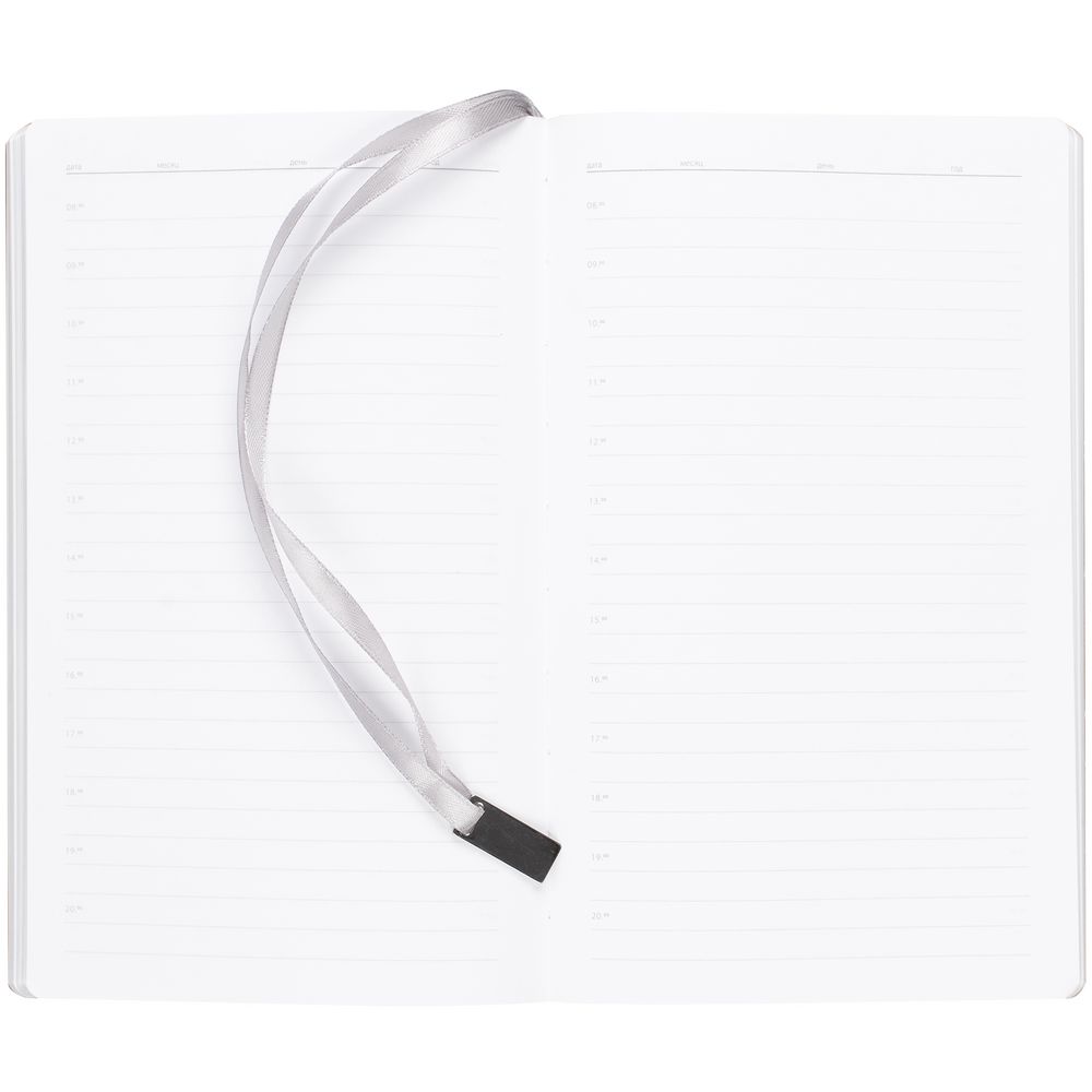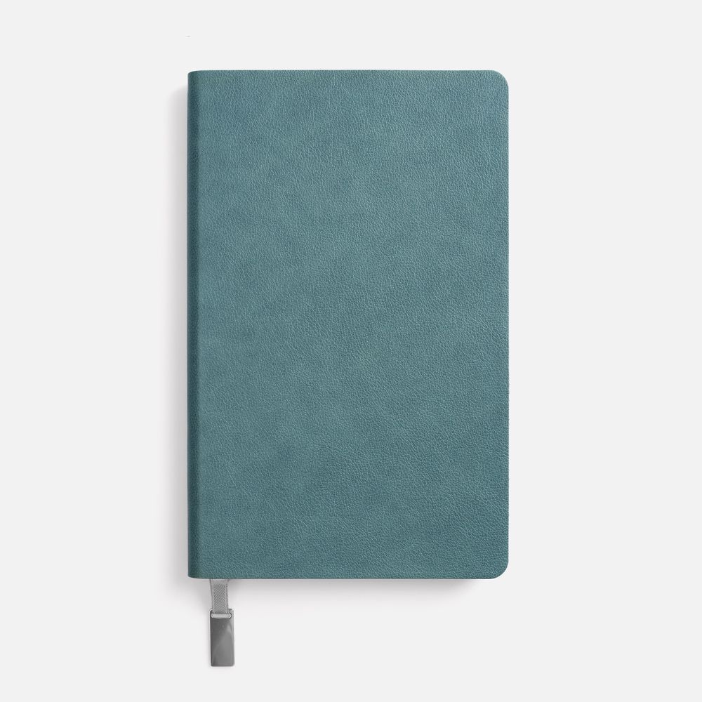 Ежедневник с гибкой обложкой, выполнен из материала Petrus, голубой JJ, дополнен серым ляссе с металлическим шильдиком.