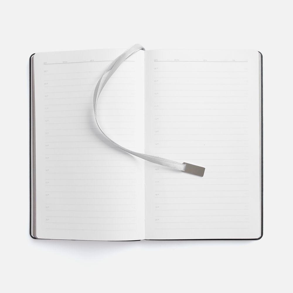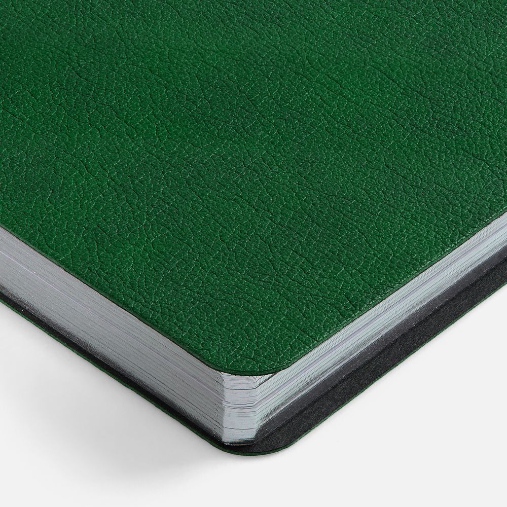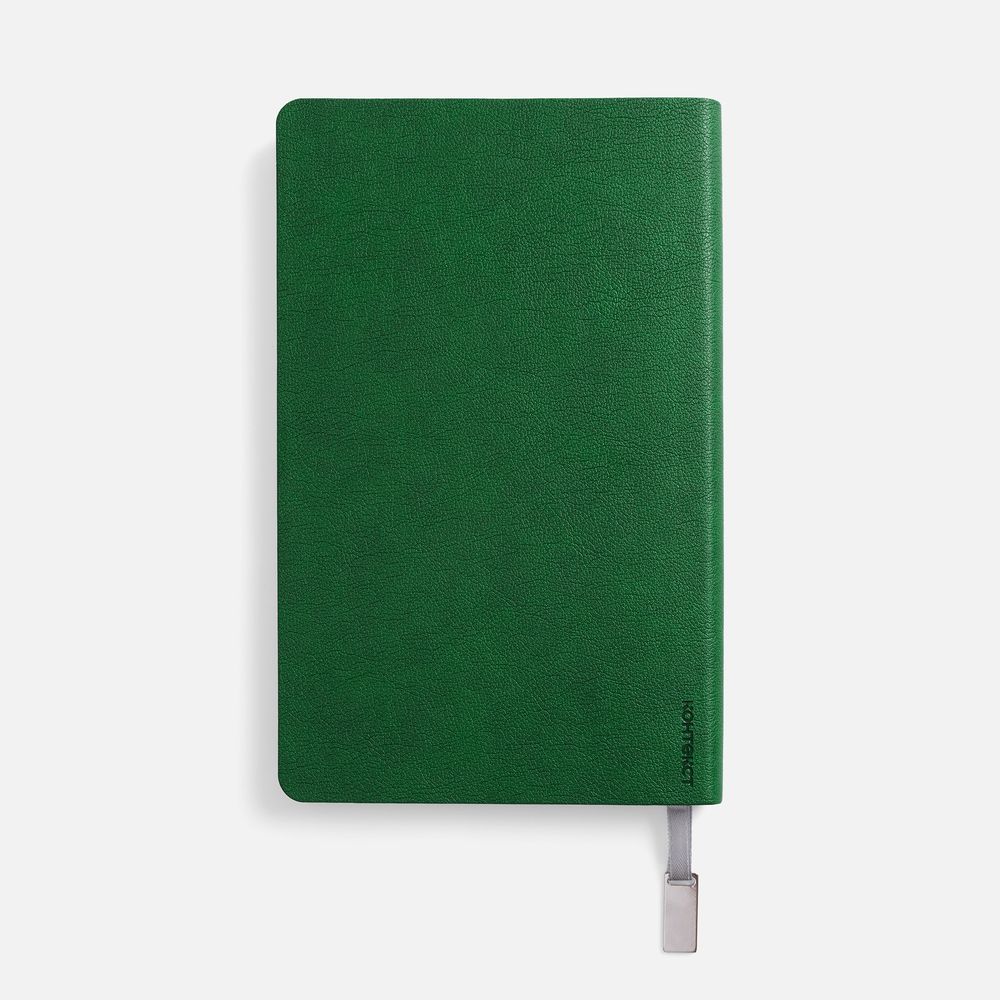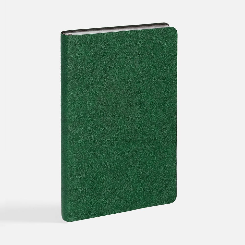Ежедневник с гибкой обложкой, выполнен из материала Petrus, зеленый FF, дополнен серым ляссе с металлическим шильдиком.