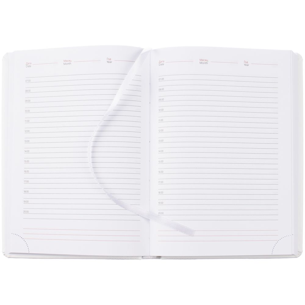 Ежедневник с твердой обложкой, выполнен из материала Waltz, белый ВВ, дополнен ляссе в цвет материала.