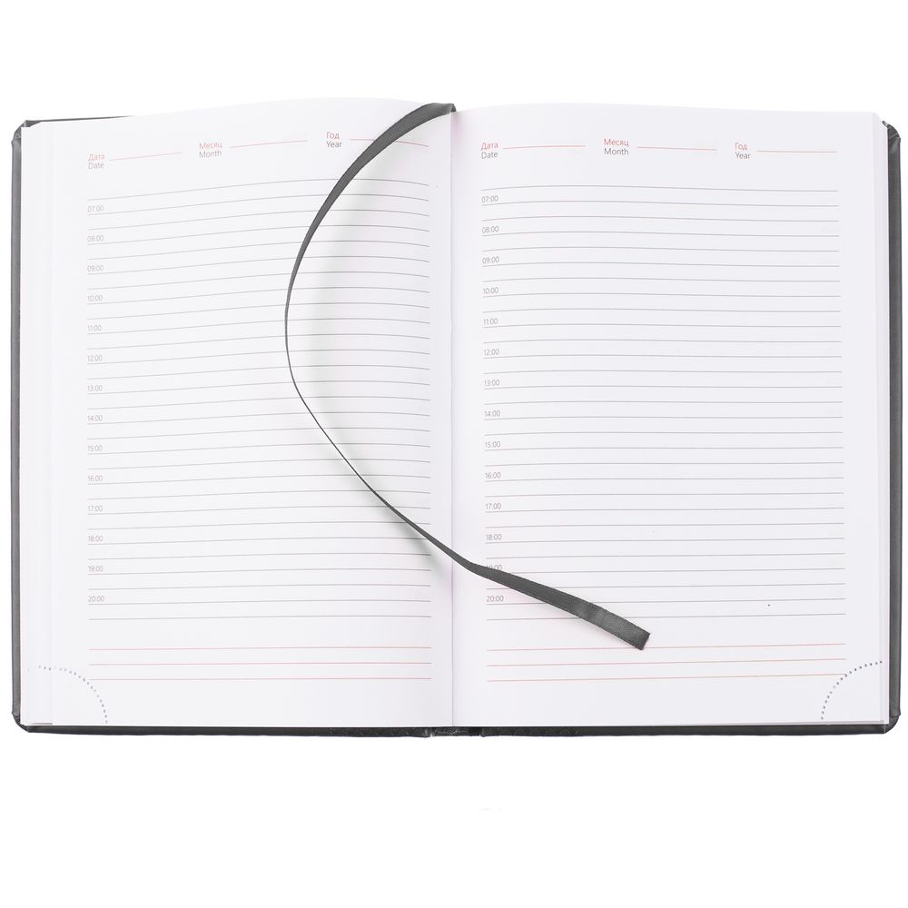 Ежедневник с твердой обложкой, выполнен из материала Waltz, темно-серый EE, дополнен ляссе в цвет материала.