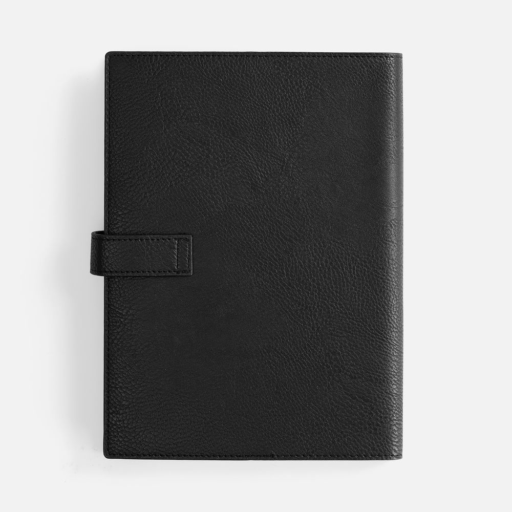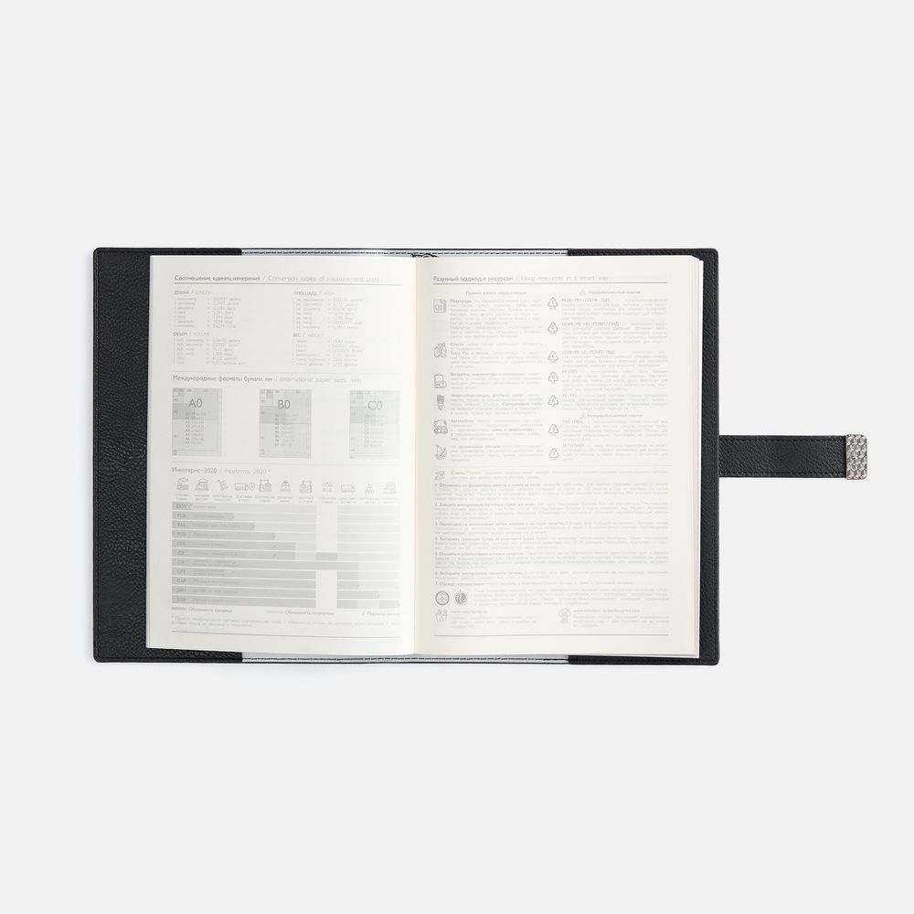 Ежедневник в мягком переплете со съемной обложкой, дополнен застежкой-хлястиком с металлическим шильдом на кнопке, двойным ляссе и капталом.