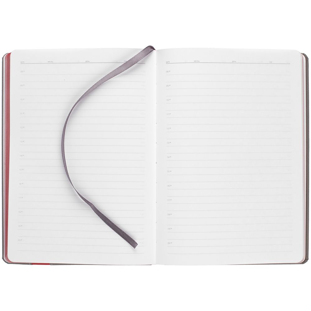 Ежедневник с твердой обложкой и тонированным обрезом. Выполнен из материала Nice Touch, серый СС, и Soft Touch Ultra, красный РР, дополнен серым ляссе.