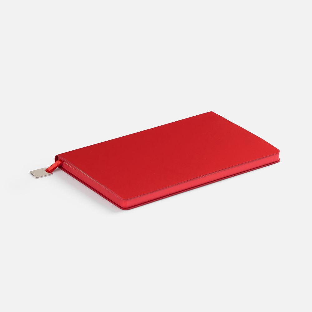 Ежедневник с гибкой обложкой, выполнен из материалов Soft Touch Ultra, красный РР, и Latte, красный (внутренняя часть обложки), дополнен ляссе в цвет обложки с металлическим шильдиком.