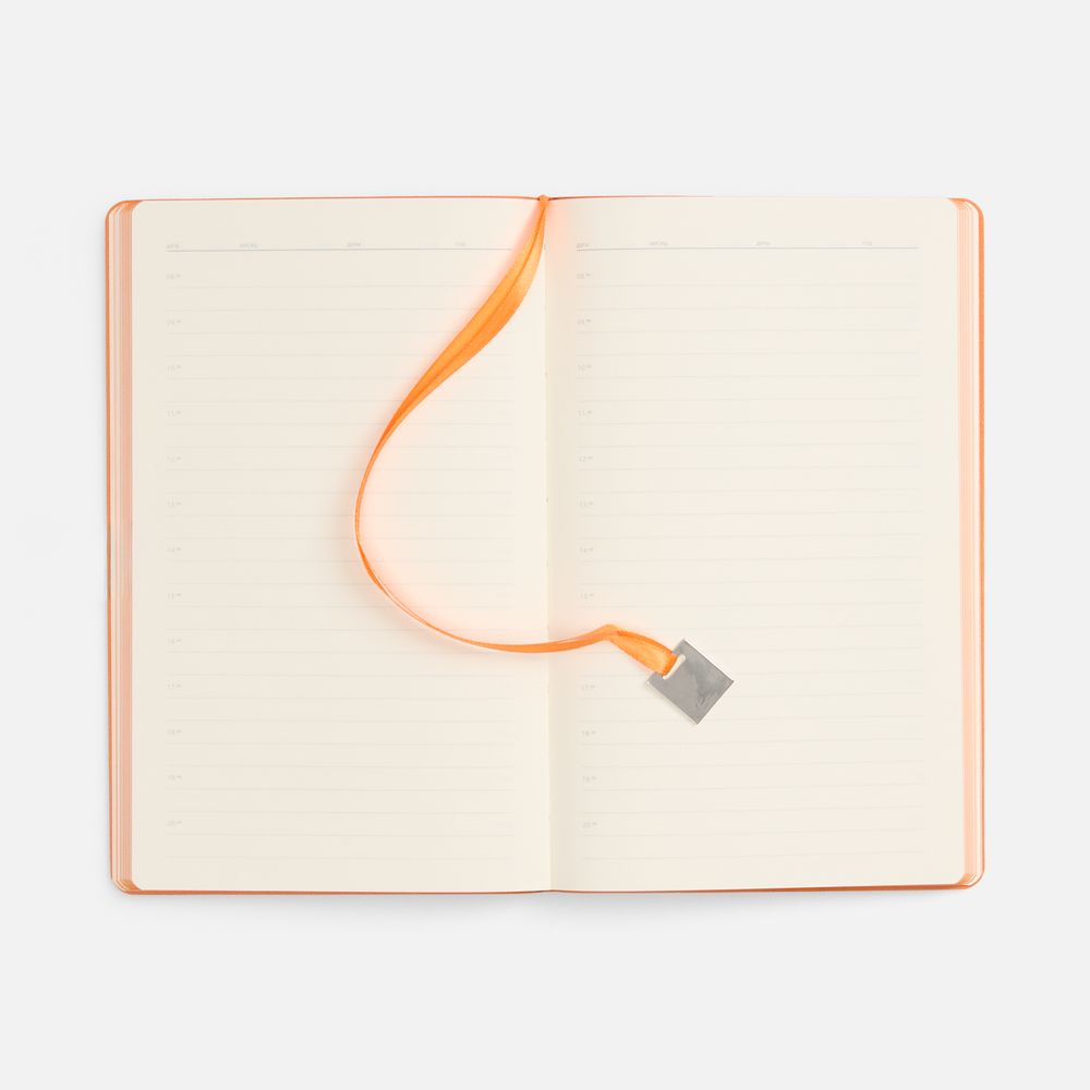 Ежедневник с гибкой обложкой, выполнен из материалов Soft Touch Pearl, оранжевый ОО, и Latte, оранжевый (внутренняя часть обложки), дополнен ляссе в цвет обложки с металлическим шильдиком.