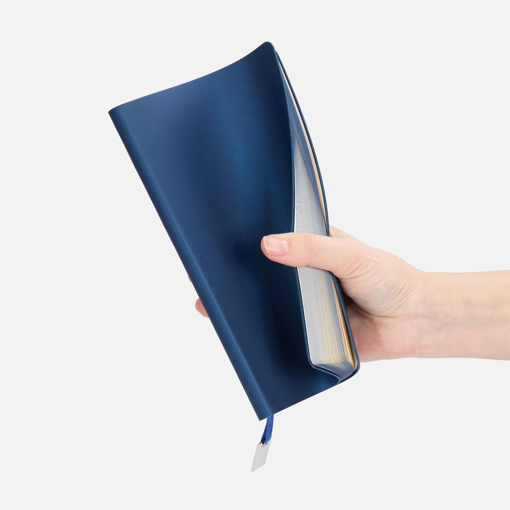Ежедневник с гибкой обложкой, выполнен из материалов Soft Touch Pearl, синий НН, и Latte, темно-синий (внутренняя часть обложки), дополнен ляссе в цвет обложки с металлическим шильдиком.