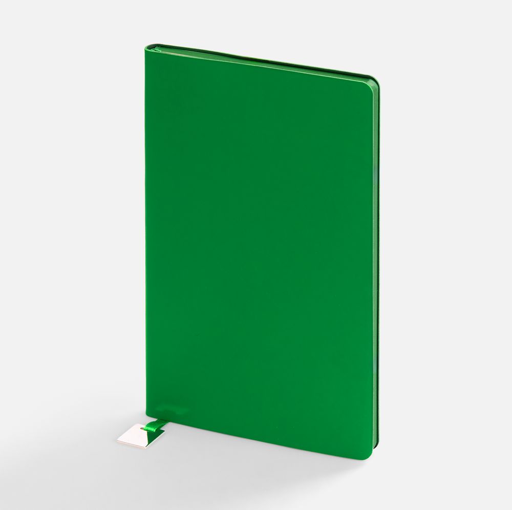 Ежедневник с гибкой обложкой, выполнен из материалов Soft Touch Ultra, зеленый FF, и Latte, зеленй (внутренняя часть обложки), дополнен ляссе в цвет обложки с металлическим шильдиком.